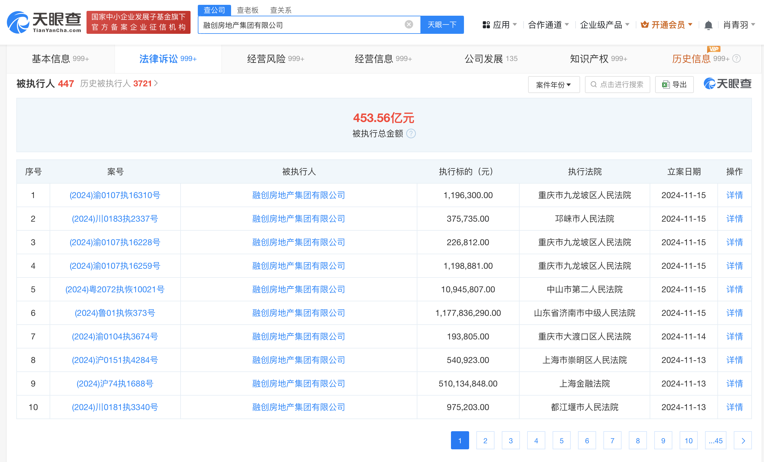 深度风险信息显示,融创房地产集团有限公司现存440余条被执行人信息,被执行总金额超453亿元。此外,该公司还存在多条限制消费令、失信被执行人(老赖)和终本案件信息。