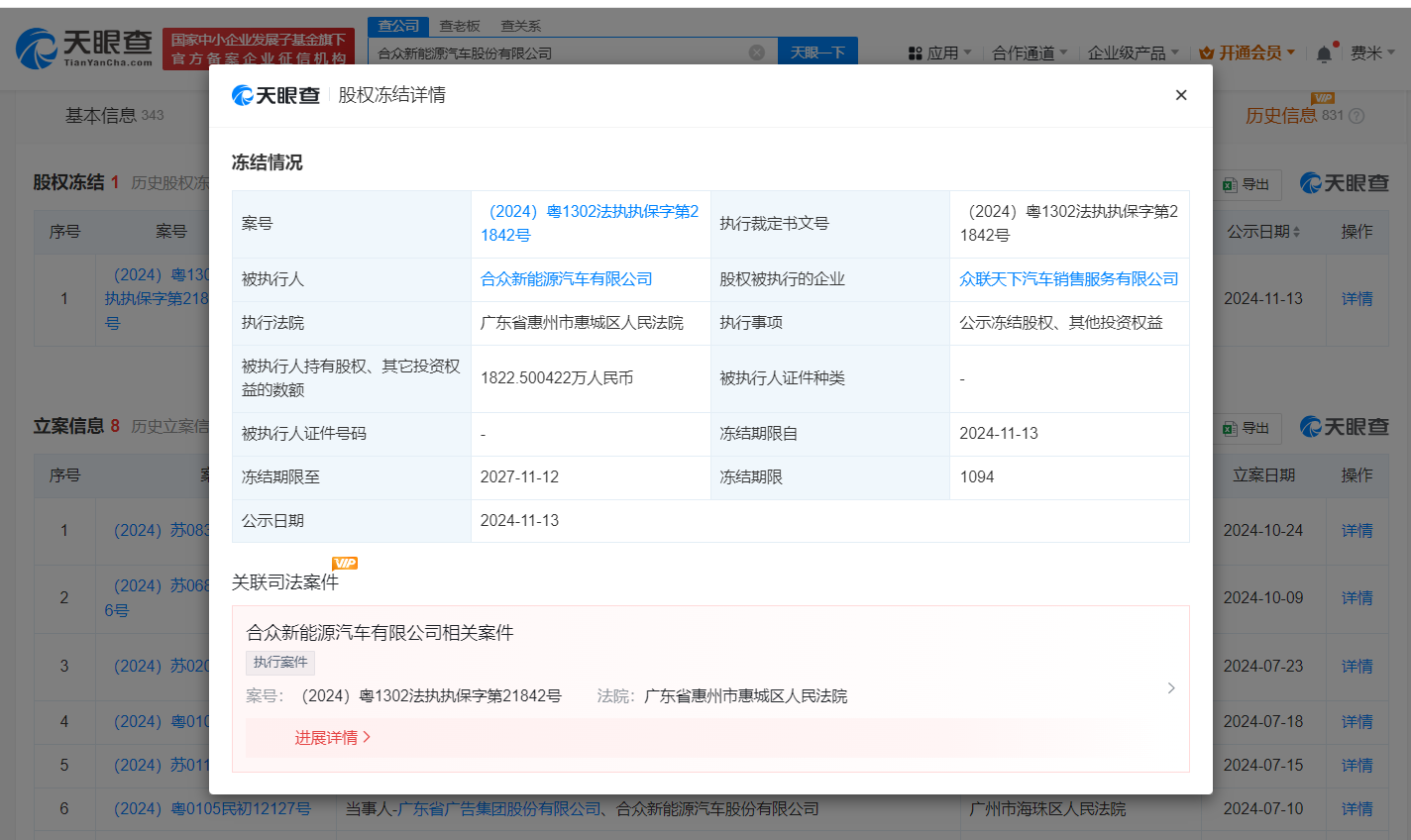 天眼查天眼风险信息显示,近日,哪吒汽车关联公司合众新能源汽车股份有限公司新增一则股权冻结信息,股权被执行的企业为众联天下汽车销售服务有限公司,冻结股权数额1822万余元人民币,冻结期限自2024年11月13日至2027年11月12日,执行法院为广东省惠州市惠城区人民法院。