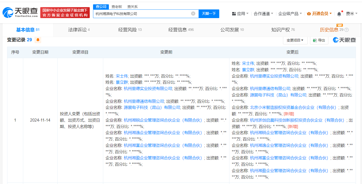 天眼查App显示,近日,杭州湘滨电子科技有限公司发生工商变更,新增北京小米智造股权投资基金合伙企业(有限合伙)、杭州浙创启晨科技创新股权投资合伙企业(有限合伙)为股东,同时注册资本由约753.4万人民币增至约824.5万人民币。