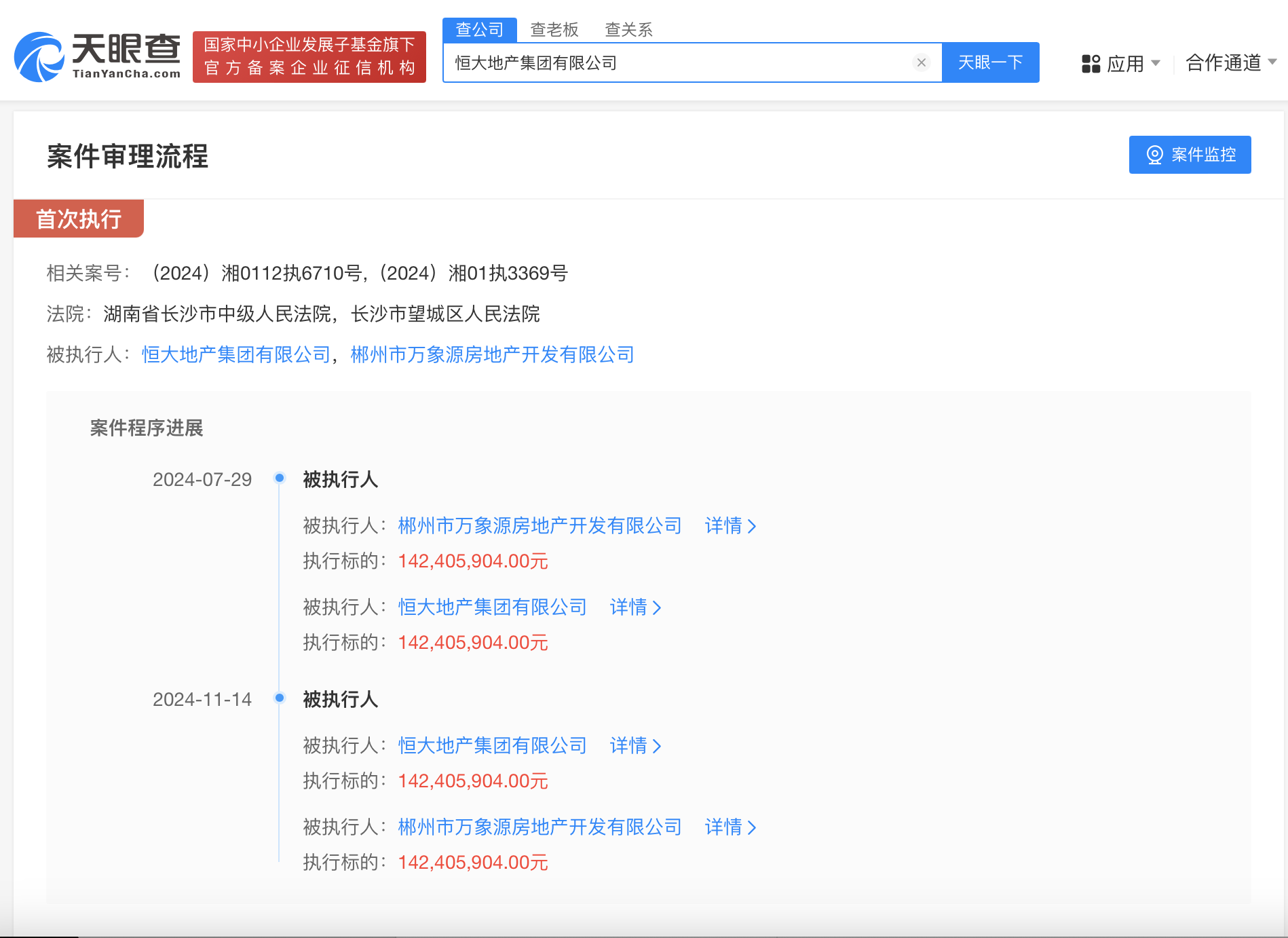 天眼查法律诉讼信息显示,11月14日,恒大地产集团有限公司新增5条被执行人和恢复执行信息,执行标的合计3.2亿余元,涉及金融借款合同纠纷、票据追索权纠纷等案件,部分案件被执行人还包括郴州市万象源房地产开发有限公司、广州市越秀住宅建设有限公司海南分公司等,执行法院包括长沙市望城区人民法院、福州市台江区人民法院等。