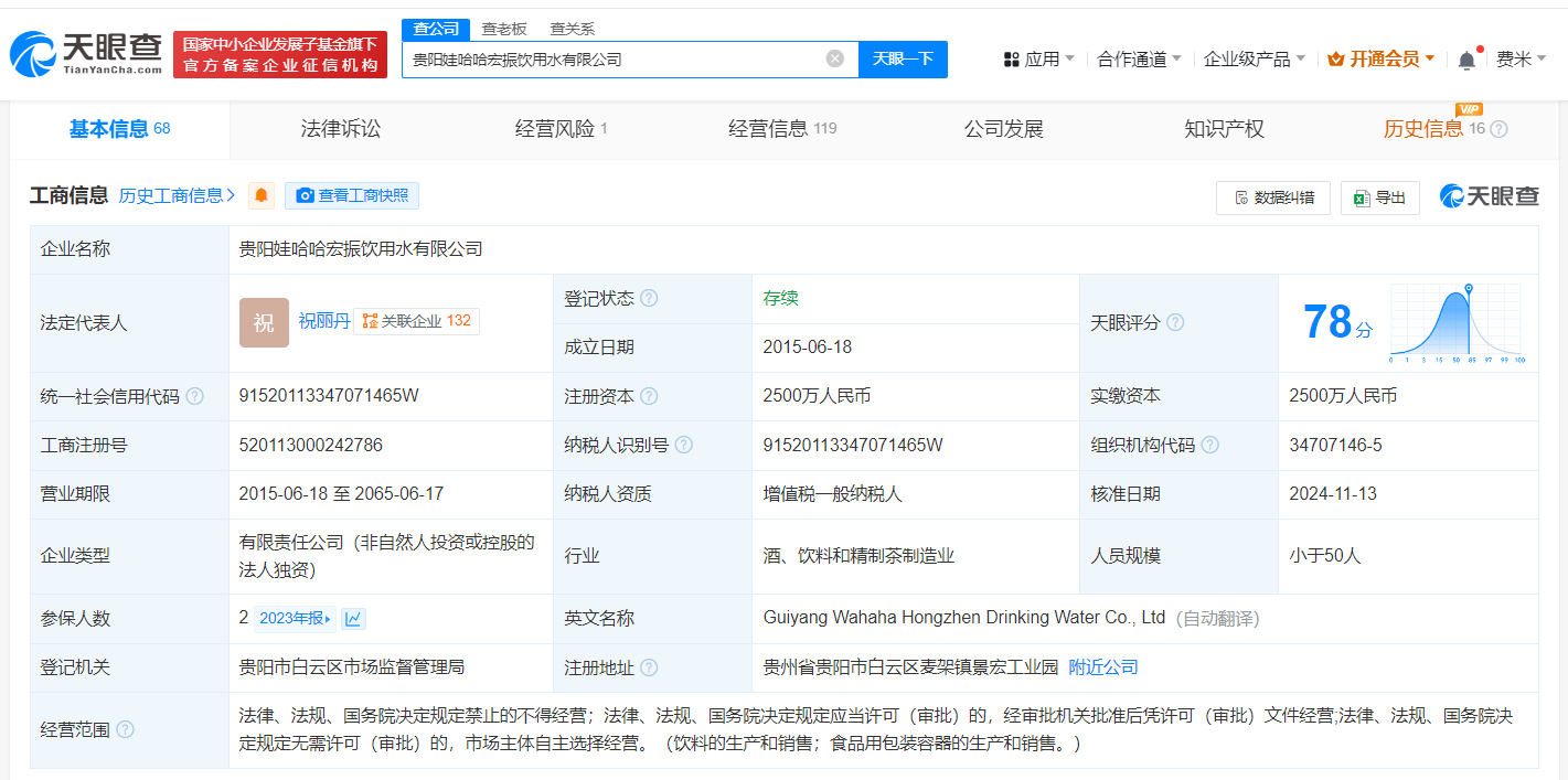 天眼查App显示,近日,贵阳娃哈哈宏振饮用水有限公司发生工商变更,宗庆后卸任法定代表人、执行董事,宗馥莉任董事,祝丽丹任法定代表人、经理,同时多位高管也发生变更。
