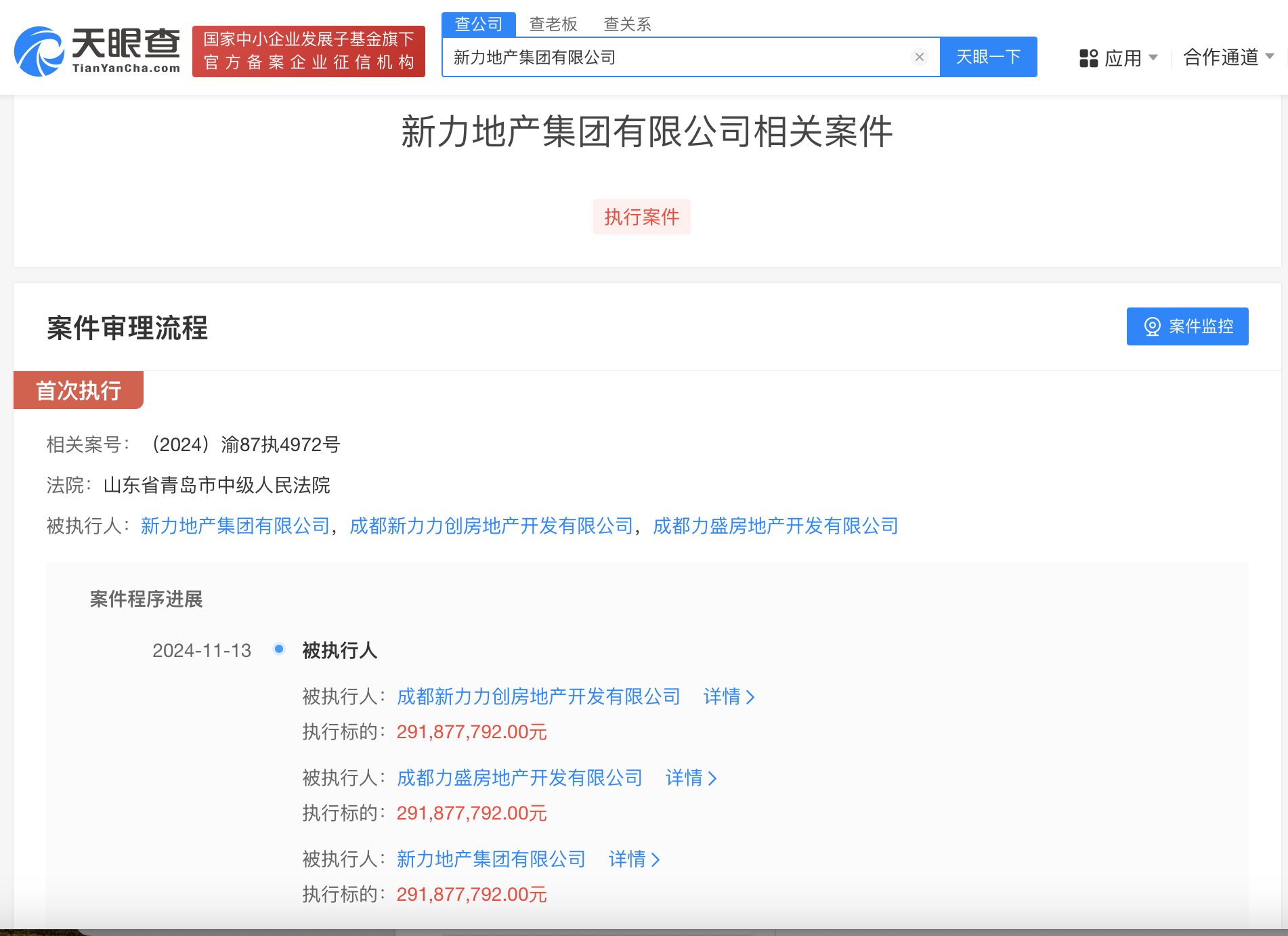 天眼查法律诉讼信息显示,11月13日,新力地产集团有限公司、成都新力力创房地产开发有限公司、成都力盛房地产开发有限公司新增一条被执行人信息,执行标的2.9亿余元,执行法院为山东省青岛市中级人民法院。