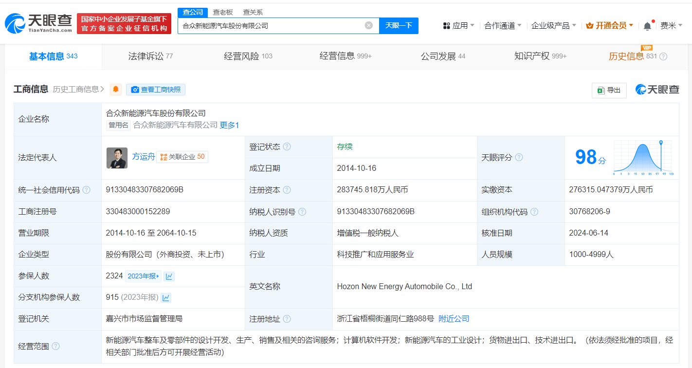 天眼查天眼风险信息显示,近日,哪吒汽车关联公司合众新能源汽车股份有限公司新增一则股权冻结信息,股权被执行的企业为众联天下汽车销售服务有限公司,冻结股权数额1822万余元人民币,冻结期限自2024年11月13日至2027年11月12日,执行法院为广东省惠州市惠城区人民法院。