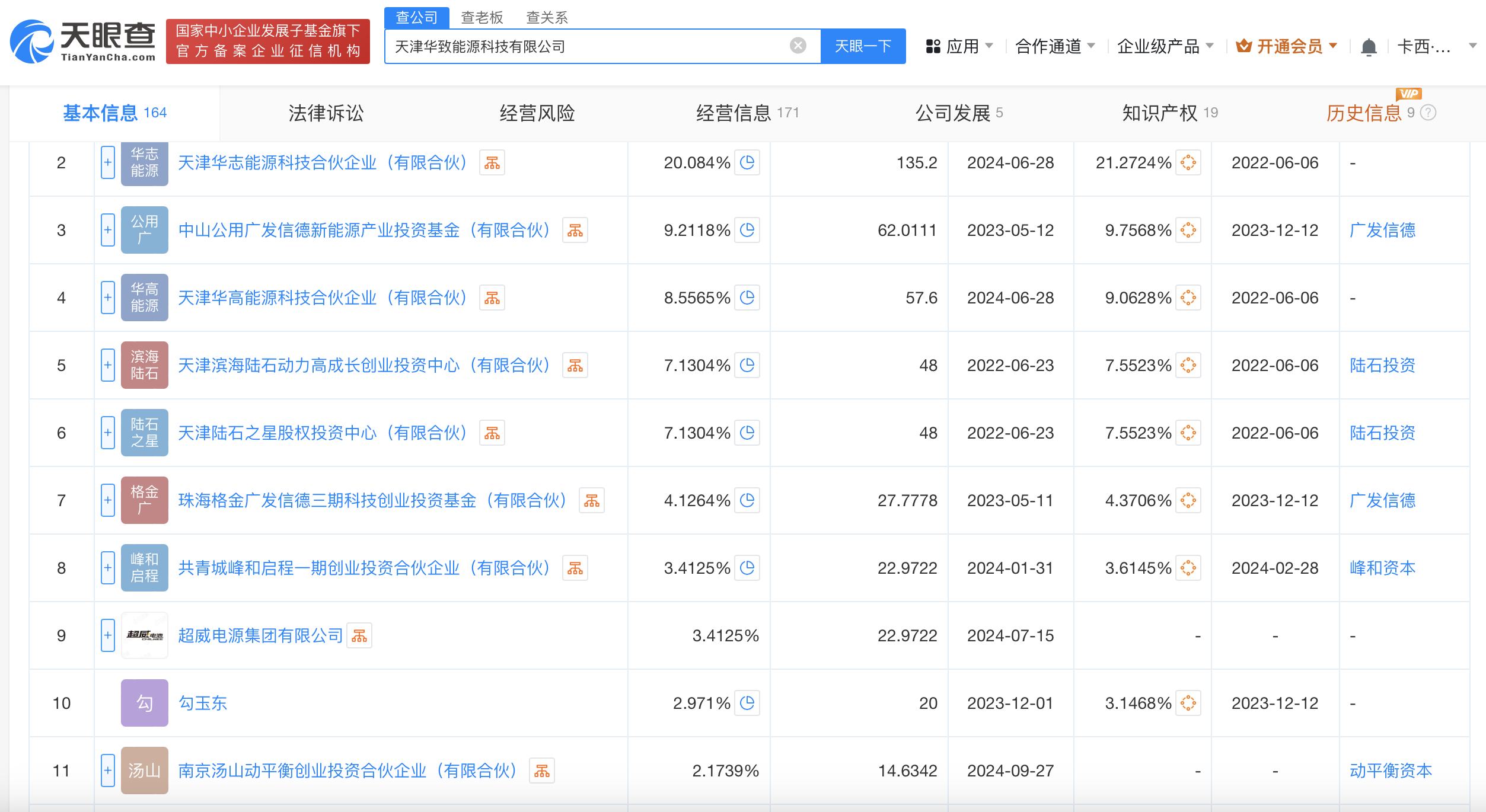 该公司成立于2022年6月,法定代表人为陈志,经营范围含新兴能源技术研发、储能技术服务、电池销售等。股东信息显示,该公司现由天津华存能源科技合伙企业(有限合伙)、天津陆石之星股权投资中心(有限合伙)及上述新增股东等共同持股。官网显示,华致能源是一家致力于储能核心设备研发、生产、销售、服务及解决方案产品化的新能源创新科技企业。