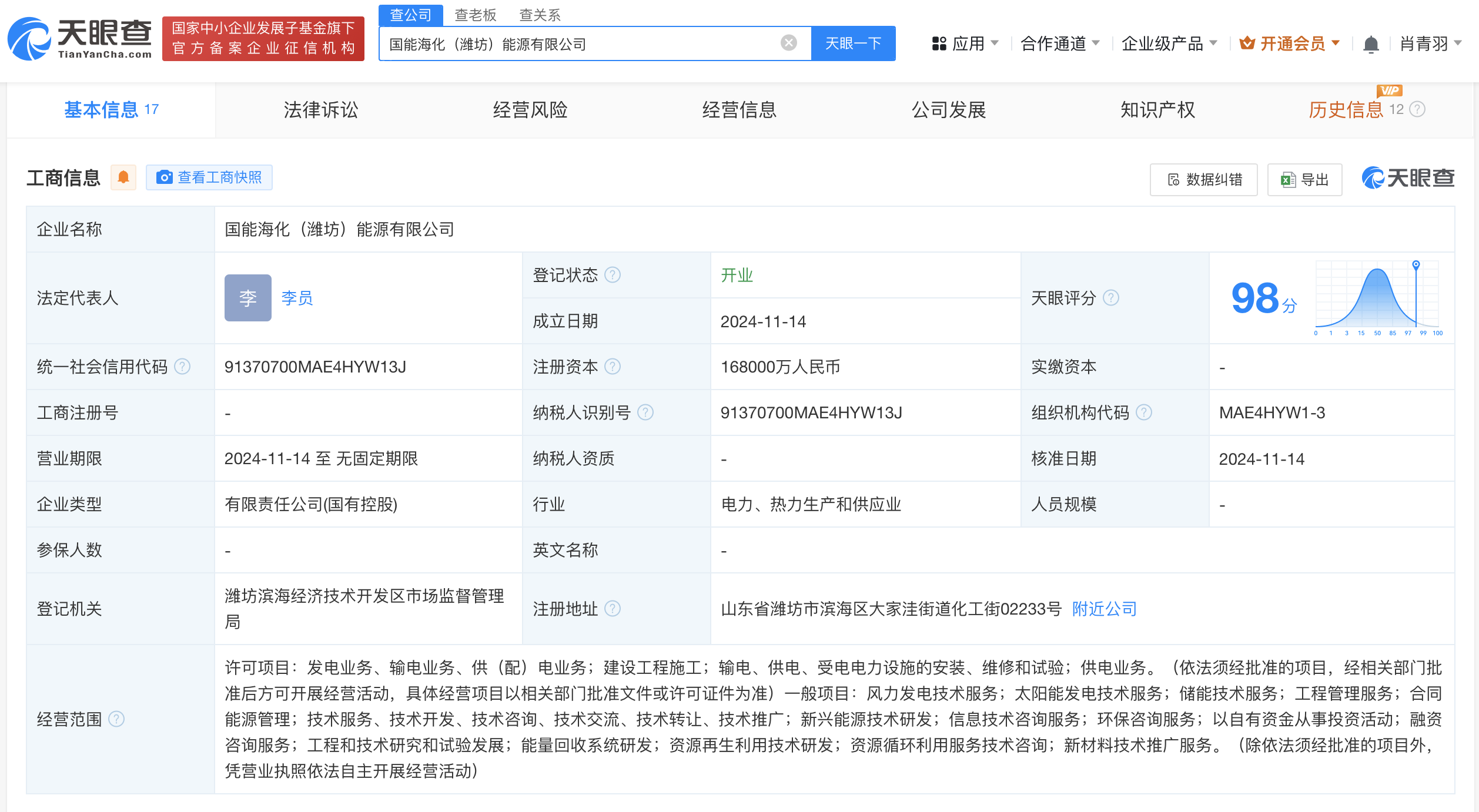 天眼查App显示,近日,国能海化(潍坊)能源有限公司成立,法定代表人为李员,注册资本16.8亿人民币,经营范围含风力发电技术服务、太阳能发电技术服务、储能技术服务、工程管理服务、合同能源管理等。股权全景穿透图显示,该公司由国电电力(600795)旗下北京国电电力新能源技术有限公司、山东滨海能源有限公司分别持股65%、35%。