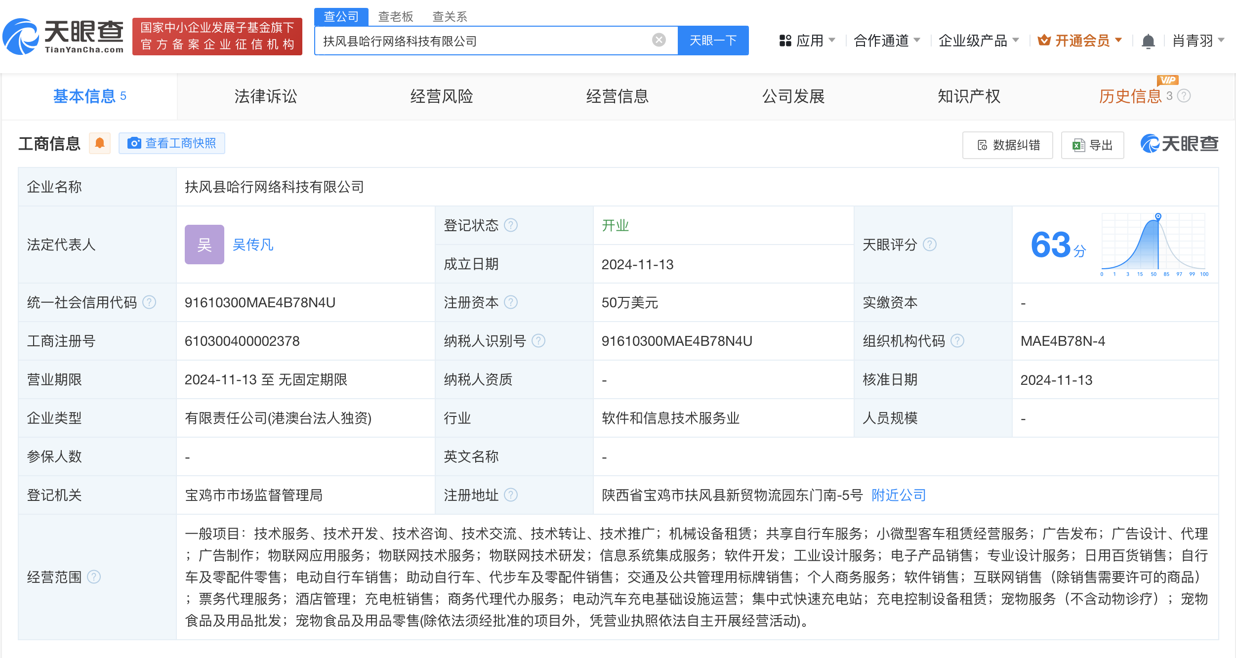 天眼查App显示,近日,扶风县哈行网络科技有限公司成立,法定代表人为吴传凡,注册资本50万美元,经营范围含物联网应用服务、物联网技术服务、物联网技术研发、信息系统集成服务、软件开发、工业设计服务等。股东信息显示,该公司由哈啰出行旗下Hong Kong RideTech Limited全资持股。