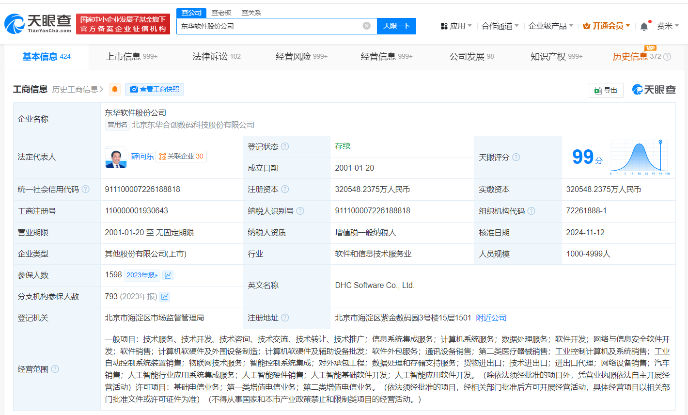 东华软件股份公司成立于2001年1月,法定代表人为薛向东,注册资本约32亿人民币,由北京东华诚信电脑科技发展有限公司、薛向东、北京东华诚信投资管理中心(有限合伙)等共同持股。