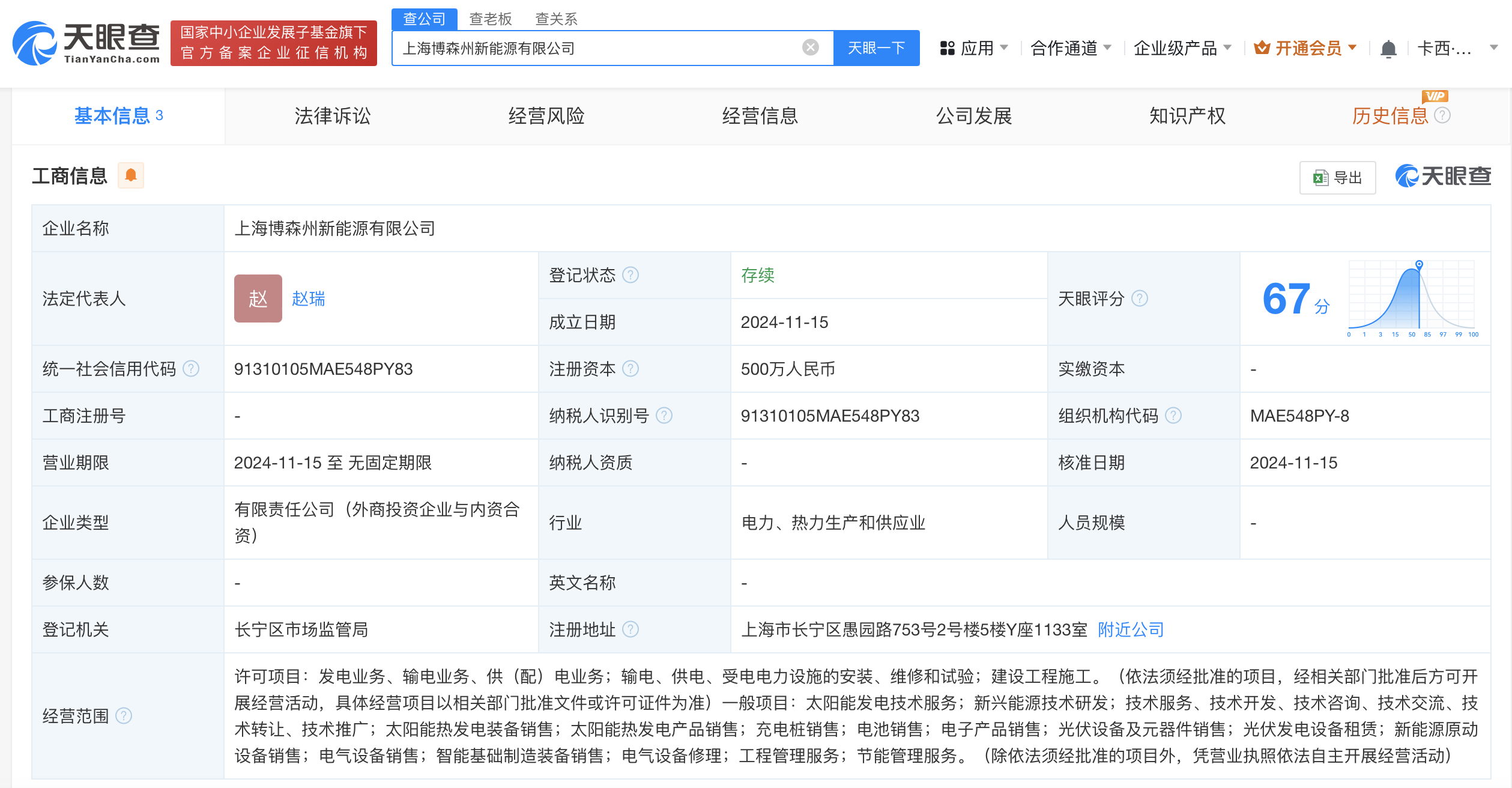 天眼查App显示,近日,上海博森州新能源有限公司成立,法定代表人为赵瑞,注册资本500万人民币,经营范围含太阳能热发电产品销售、充电桩销售、电池销售、电子产品销售等。股东信息显示,该公司由森特股份(603098)、上海中州海能新能源发展有限公司、上海博锐枫新能源有限公司共同持股。