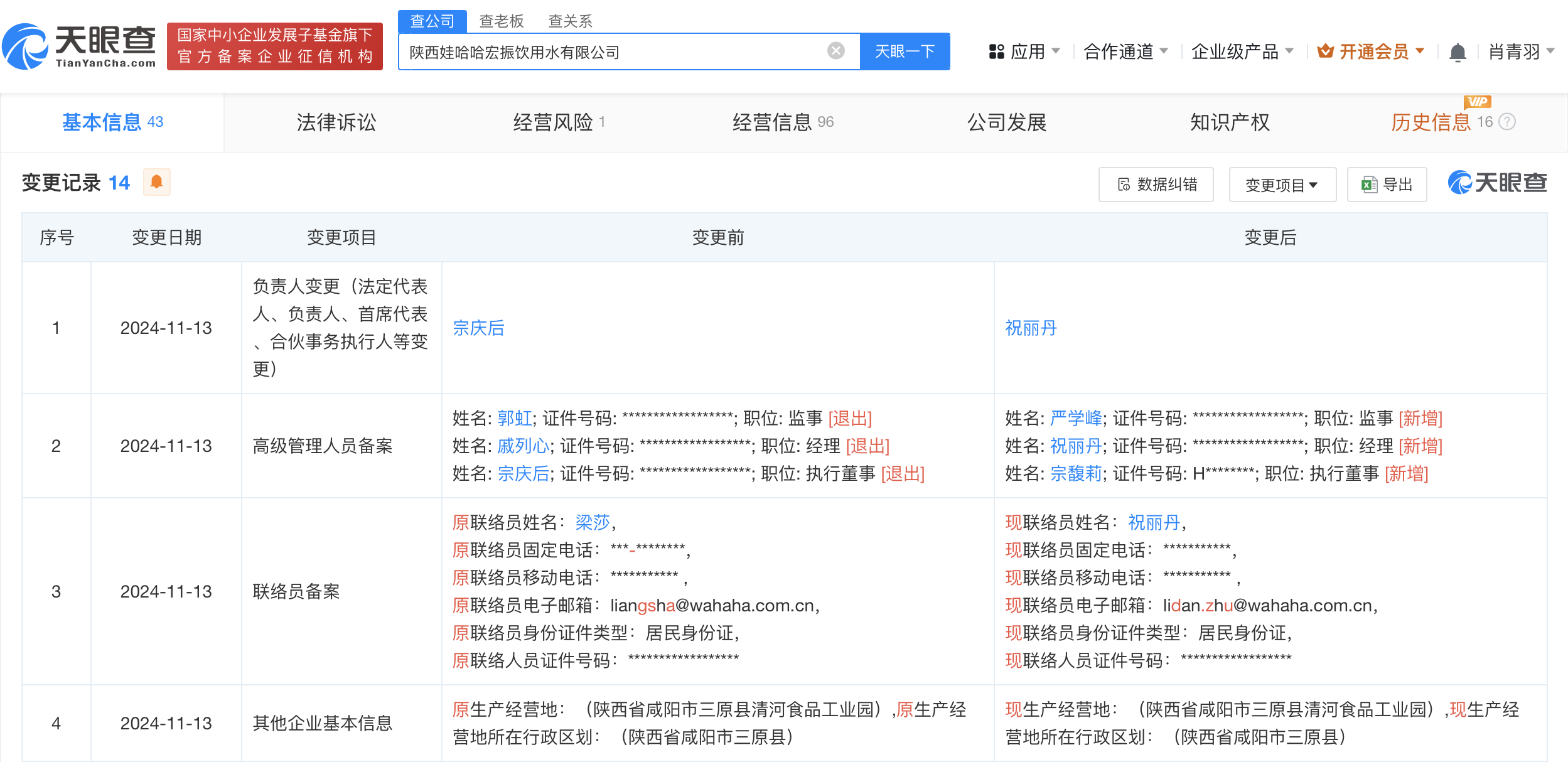 天眼查App显示,近日,江山娃哈哈宏振饮用水有限公司、济宁娃哈哈宏振饮用水有限公司、陕西娃哈哈宏振饮用水有限公司发生工商变更,宗庆后卸任上述公司法定代表人、执行董事,由宗馥莉任董事或执行董事,由祝丽丹任法定代表人、经理,同时多位高管均发生变更。