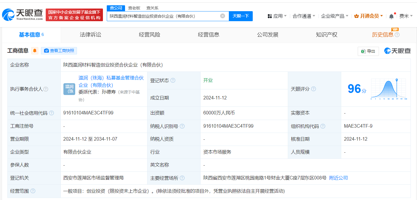 天眼查App显示,近日,陕西温润材料智造创业投资合伙企业(有限合伙)成立,执行事务合伙人为温润(珠海)私募基金管理合伙企业(有限合伙),出资额6亿人民币,经营范围为创业投资。股权全景穿透图显示,该合伙企业由温氏股份(300498)旗下广东温氏投资有限公司、西安市创新投资基金合伙企业(有限合伙)、陕西省政府投资引导基金合伙企业(有限合伙)等共同出资。