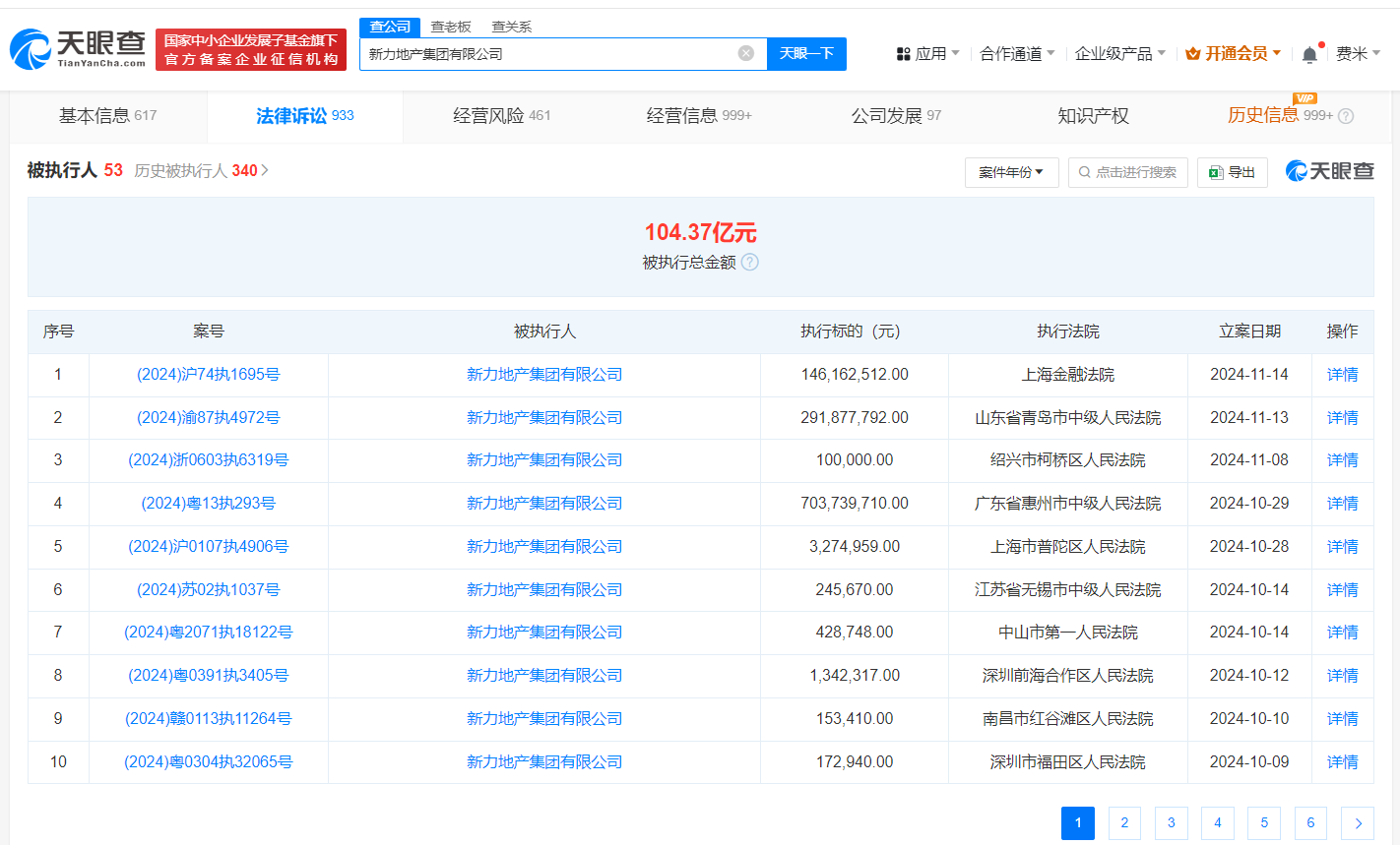 天眼查法律诉讼信息显示,11月14日,新力地产集团有限公司、南昌顺泰置业有限公司、南昌天华置业有限公司新增一则被执行人信息,执行标的1.4亿余元,涉及融资租赁合同纠纷案件,执行法院为上海金融法院。