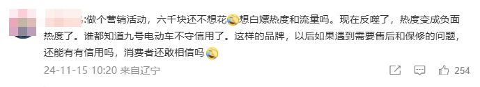 南京广播电视台《南京零距离》栏目也报道称,江苏的冯先生在网络直播间看到九号电动车在搞双11活动,原价6399元的电动车,直降优惠6099元,只要300元,赶紧下单抢购。第二天他就到九号电动车实体门店去提车,公司却拒绝交车。