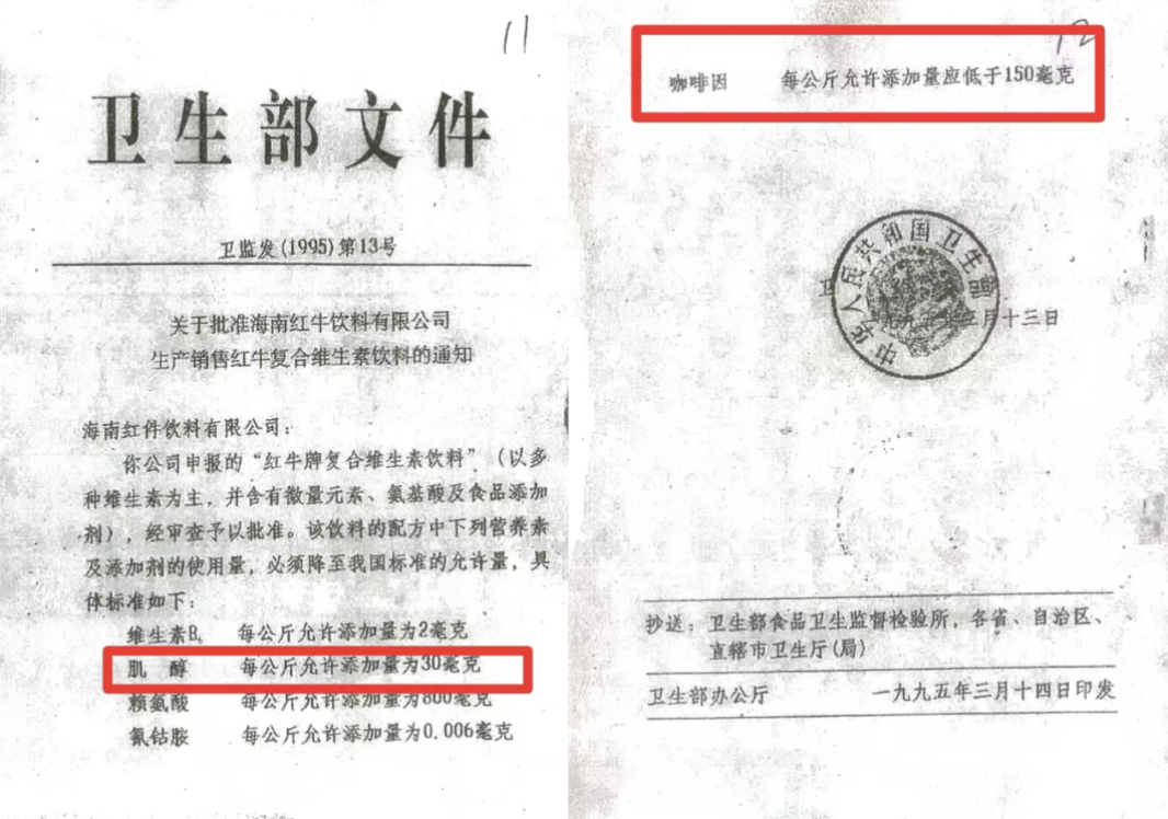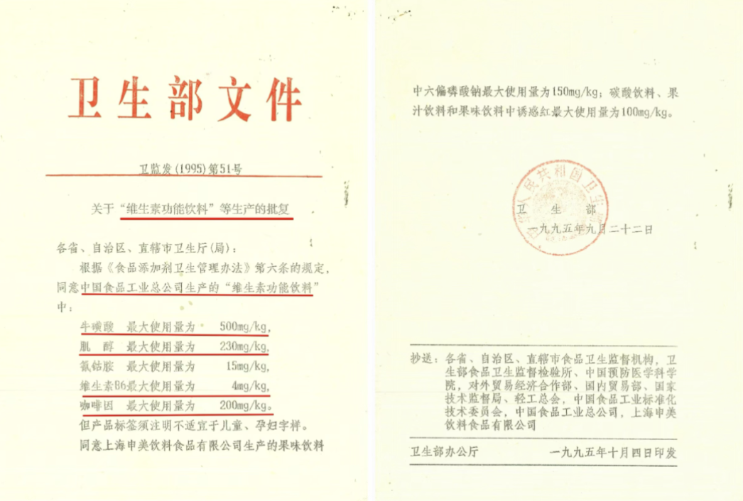 1995年3月,许书标先生和华彬集团严彬先生合作后,严彬找到中国食品工业总公司、深圳中浩集团合作。1995年3月29日,中食公司向卫生部申请“维生素功能饮料”营养素含量行政许可批文。1995年9月22日、卫生部针对中国食品工业总公司作出的批复(卫监发[1995]第51号),“同意中国食品工业总公司生产的‘维生素功能饮料’中牛磺酸最大使用量为500mg/kg、肌醇最大使用量为230mg/kg、氰钴胺最大使用量为15mg/kg、维生素B6最大使用量为4mg/kg、咖啡因最大使用量为200mg/kg”,后中食公司将此“维生素功能饮料”批文及配方投入到合资公司,此即“合资公司产品”专有名称的来源,一直在中国使用了29年,其成份含量也从未发生过实质变化。