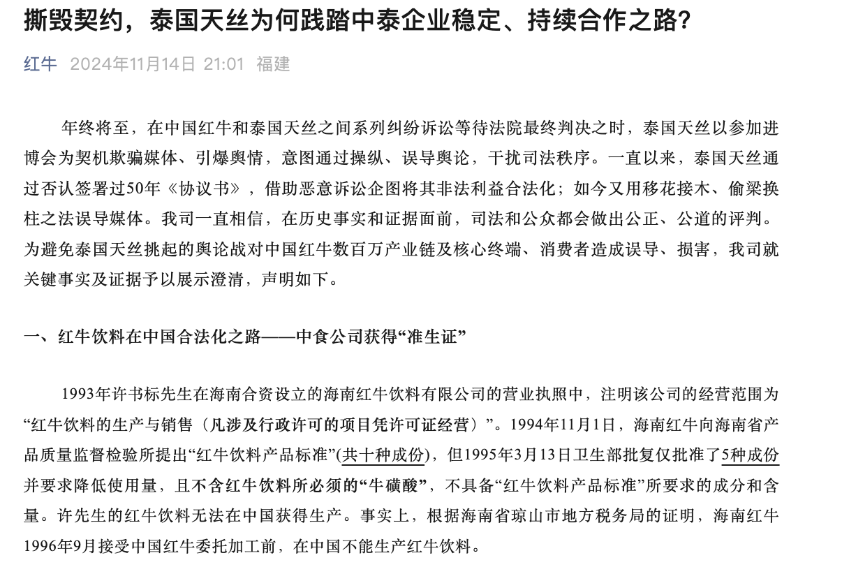 年终将至,在中国红牛和泰国天丝之间系列纠纷诉讼等待法院最终判决之时,泰国天丝以参加进博会为契机欺骗媒体、引爆舆情,意图通过操纵、误导舆论,干扰司法秩序。一直以来,泰国天丝通过否认签署过50年《协议书》,借助恶意诉讼企图将其非法权益合法化;如今又用移花接木、偷梁换柱之法误导媒体。我司一直相信,在历史事实和证据面前,司法和公众都会做出公正、公道的评判。为避免泰国天丝挑起的舆论战对中国红牛数百万产业链及核心终端、消费者造成误导、损害,我司就关键事实及证据予以展示澄清,声明如下。