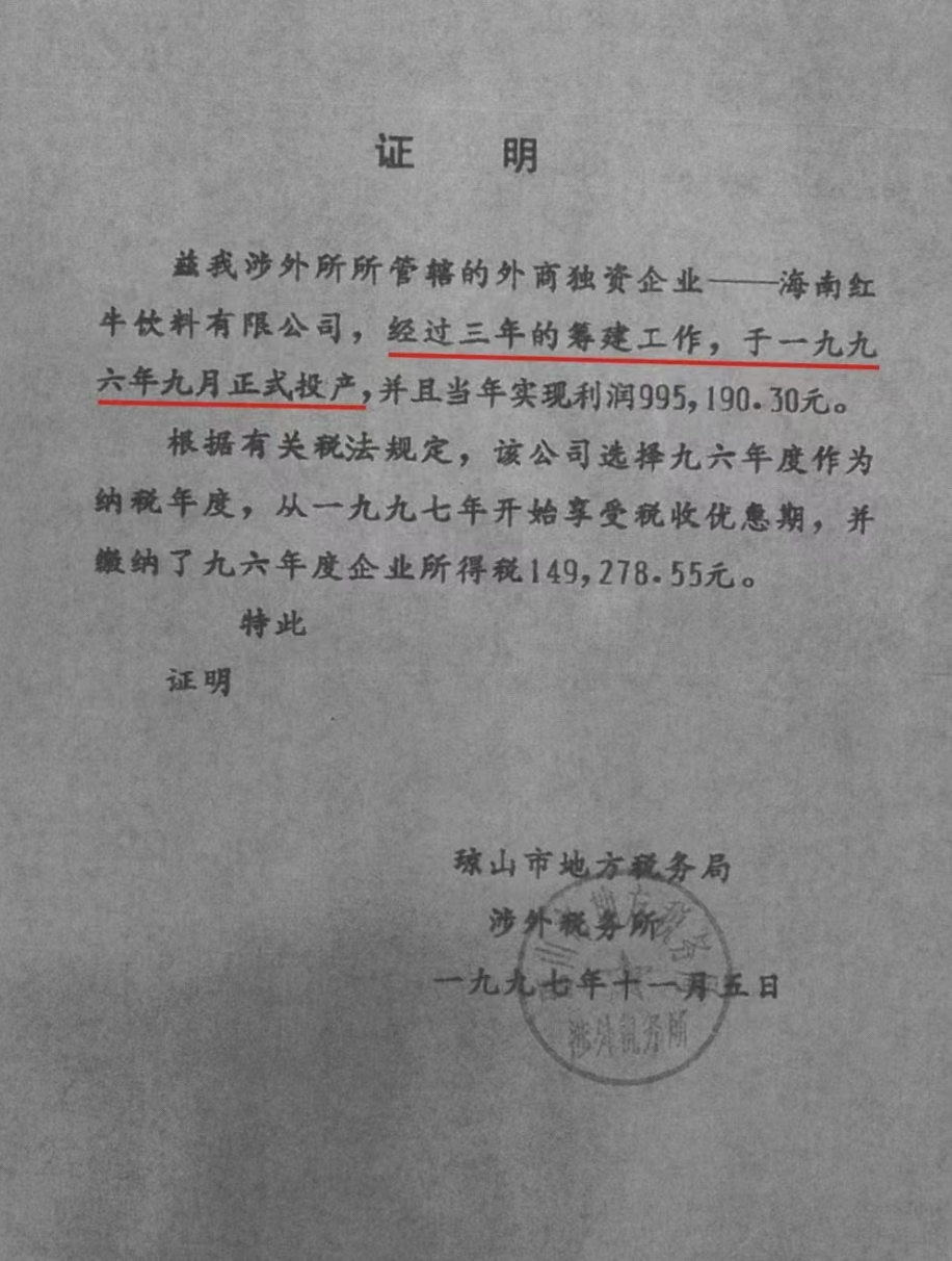 1993年许书标先生在海南合资设立的海南红牛饮料有限公司的营业执照中,注明该公司的经营范围为“红牛饮料的生产与销售(凡涉及行政许可的项目凭许可证经营)”。1994年11月1日,海南红牛向海南省产品质量监督检验所提出“红牛饮料产品标准” (共10种成份),但1995年3月13日卫生部批复仅批准了5种成份并要求降低使用量,且不含红牛饮料所必须的“牛磺酸”,不具备“红牛饮料产品标准”所要求的成分和含量。许先生的红牛饮料无法在中国获得生产。事实上,根据海南省琼山市地方税务局的证明,海南红牛1996年9月接受中国红牛委托加工前,在中国不能生产红牛饮料。