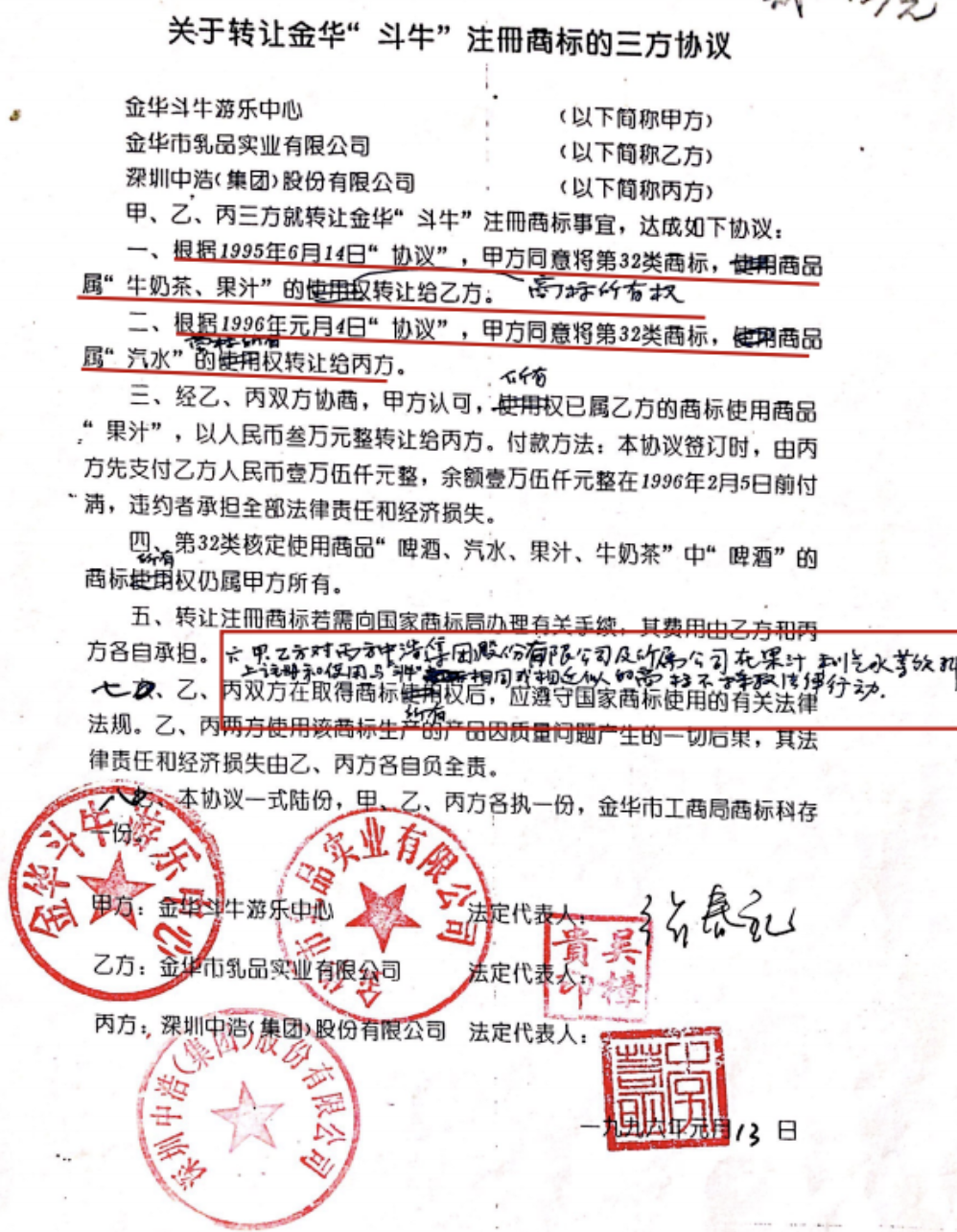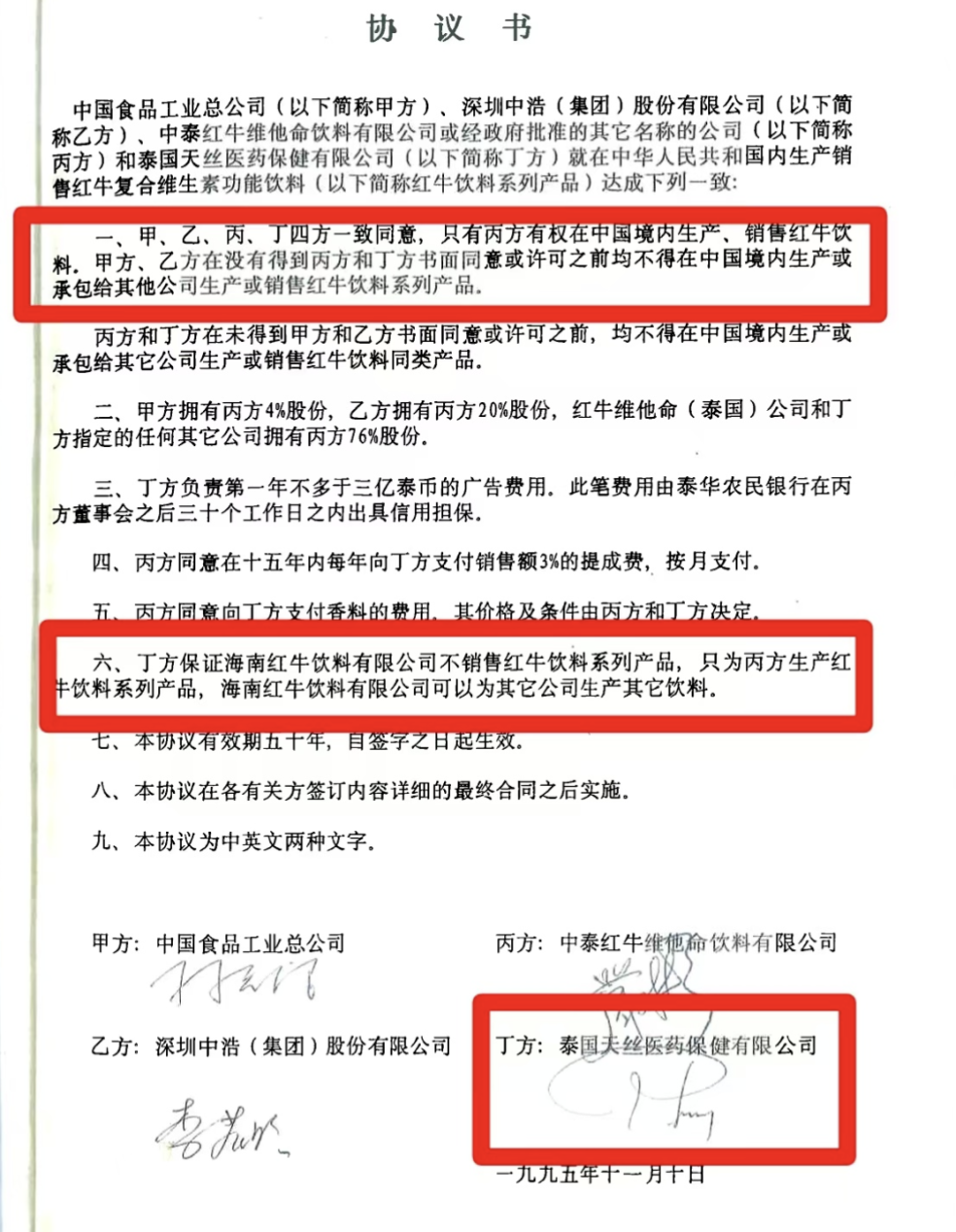 中食公司于1995年9月取得卫生部生产许可批文后,1995年11月10日中泰各方签署有效期为50年的《协议书》,约定只有中国红牛有权在中国生产销售红牛饮料,泰国天丝不能经营红牛饮料,海南红牛只能为中国红牛生产红牛饮料。同年,中泰双方股东签订《95年合资合同》,约定中国红牛产品上的商标是中国红牛的资产。1996年1月,中浩公司购买斗牛商标,解决红牛商标在中国使用和注册的障碍。