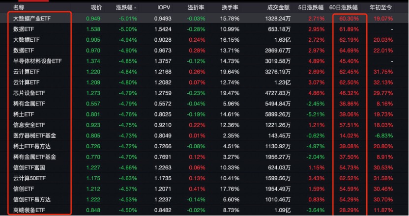 从ETF来看,除了银行板块收红,多数ETF出现回调,其中此前大涨的大数据、半导体、芯片跌幅明显。全市场53只场内ETF单日跌幅超过4%。这些ETF中不少产品近60日涨幅超过60%之多。
