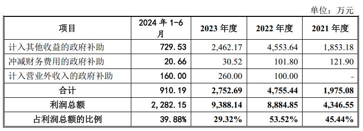 依据万泰股份招股说明书和北交所问询回复函等公告披露的信息,报告期内(2021年至2024年上半年),万泰股份计入当期损益的政府补助金额分别为 1,975.08 万元、 4,755.44万元、 2,752.69 万元和 910.19 万元,占当期利润总额的比例分别为 45.44%、54.52%、 29.32%和 39.88%。