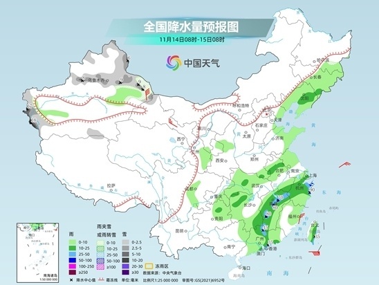 今天(11月14日),中东部降雨范围缩减,不过受台风“桃芝”影响,广东、江西、浙江等地将有中到大雨,局地暴雨。明天开始,随着一股强冷空气东移南下,中东部还将迎来新一轮大范围降水过程,并扭转近期偏暖格局,本周末至下周二中东部气温纷纷大跳水,将大面积刷新下半年来新低。