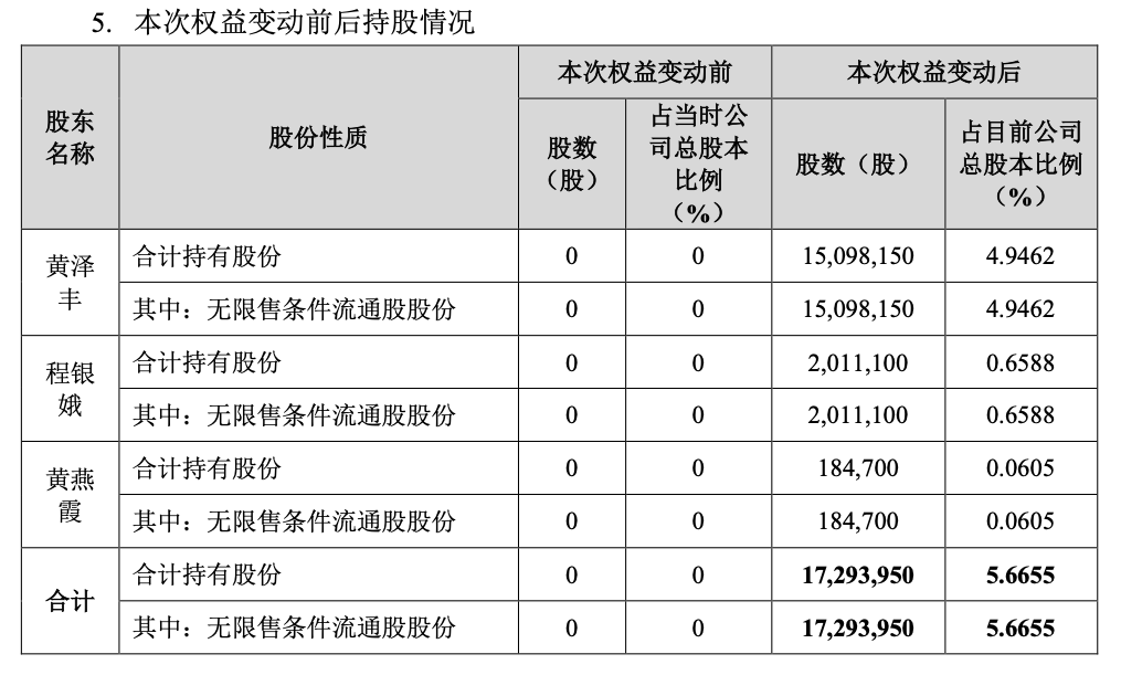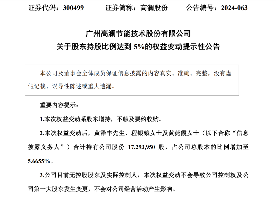 11月11日晚间,高澜股份公告称,公司股东黄泽丰、程银娥及黄燕霞在2024年10月18日至2024年11月7日期间,通过二级市场集中竞价方式累计增持公司股份约1729.4万股,约占公司总股本的5.67%。而在此之前,三人并未持有该公司股票。