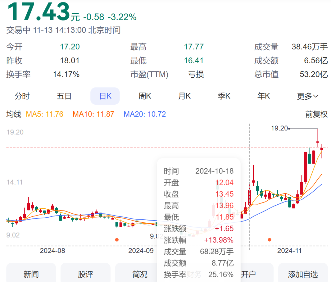 11月13日,高澜股份股价大幅回落,盘中一度跌逾8%;截至当日午间休市,高澜股份每股报17.31元,跌幅3.89%,总市值52.84亿元。