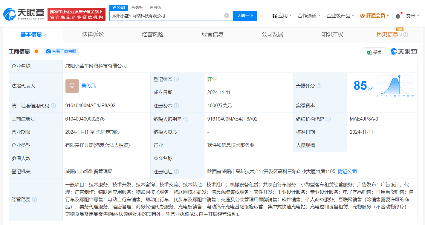 天眼查App显示,近日,咸阳小蓝车网络科技有限公司成立,法定代表人为吴传凡,注册资本1000万美元,经营范围含机械设备租赁、共享自行车服务、小微型客车租赁经营服务、广告制作、物联网应用服务、物联网技术服务等。股东信息显示,该公司由哈啰出行旗下Hong Kong RideTech Limited全资持股。