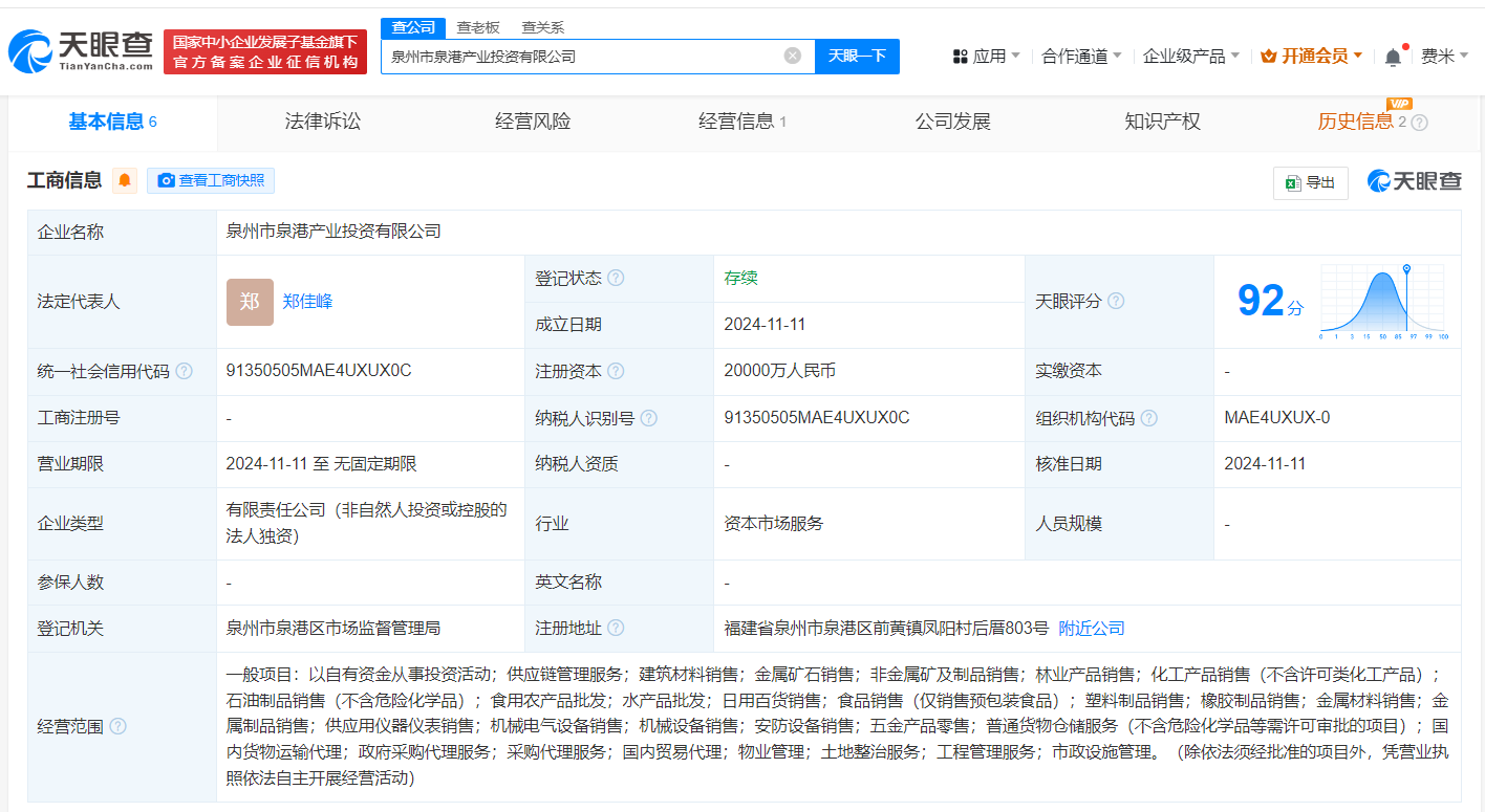 天眼查App显示,近日,泉州市泉港产业投资有限公司成立,法定代表人为郑佳峰,注册资本2亿人民币,经营范围含以自有资金从事投资活动、供应链管理服务、建筑材料销售、金属矿石销售、食用农产品批发、水产品批发等。股东信息显示,该公司由泉州市泉港区国有资产管理委员会全资持股。