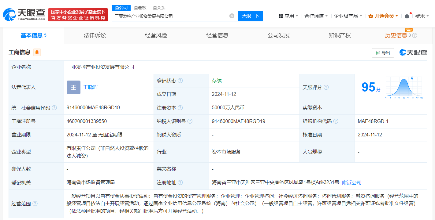 天眼查App显示,近日,三亚发控产业投资发展有限公司成立,法定代表人为王晓晖,注册资本5亿人民币,经营范围含以自有资金从事投资活动、自有资金投资的资产管理服务、企业管理、企业管理咨询、社会经济咨询服务、咨询策划服务等。股东信息显示,该公司由三亚发展控股有限公司全资持股。