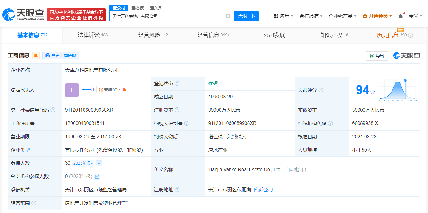 天津万科房地产有限公司成立于1996年3月,法定代表人为王一川,注册资本3.9亿人民币,由香港永达中国投资有限公司、万科A(000002)共同持股。