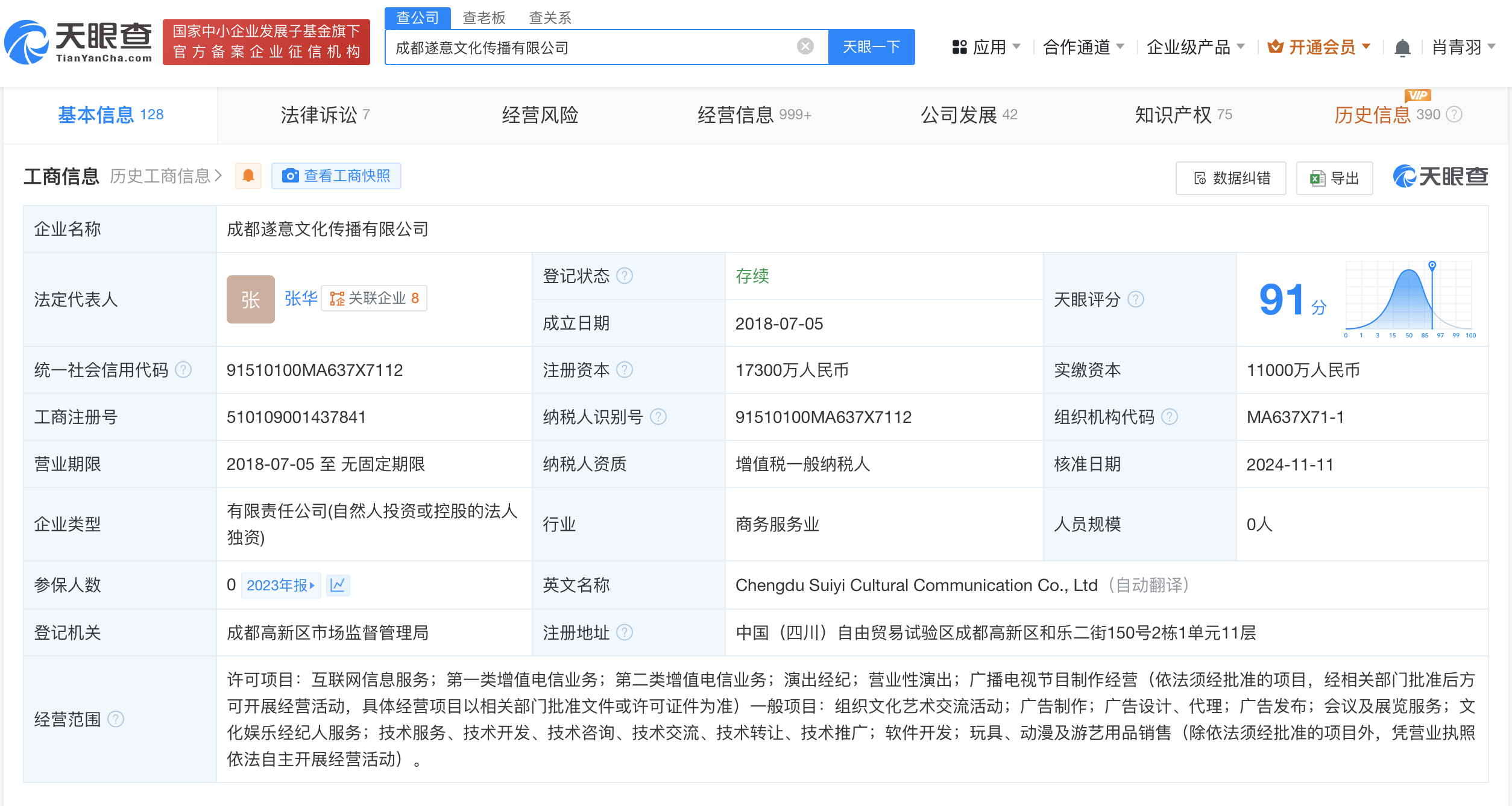 天眼查App显示,近日,成都遂意文化传播有限公司发生工商变更,注册资本由1.1亿人民币增至1.73亿人民币,增幅约57.27%。