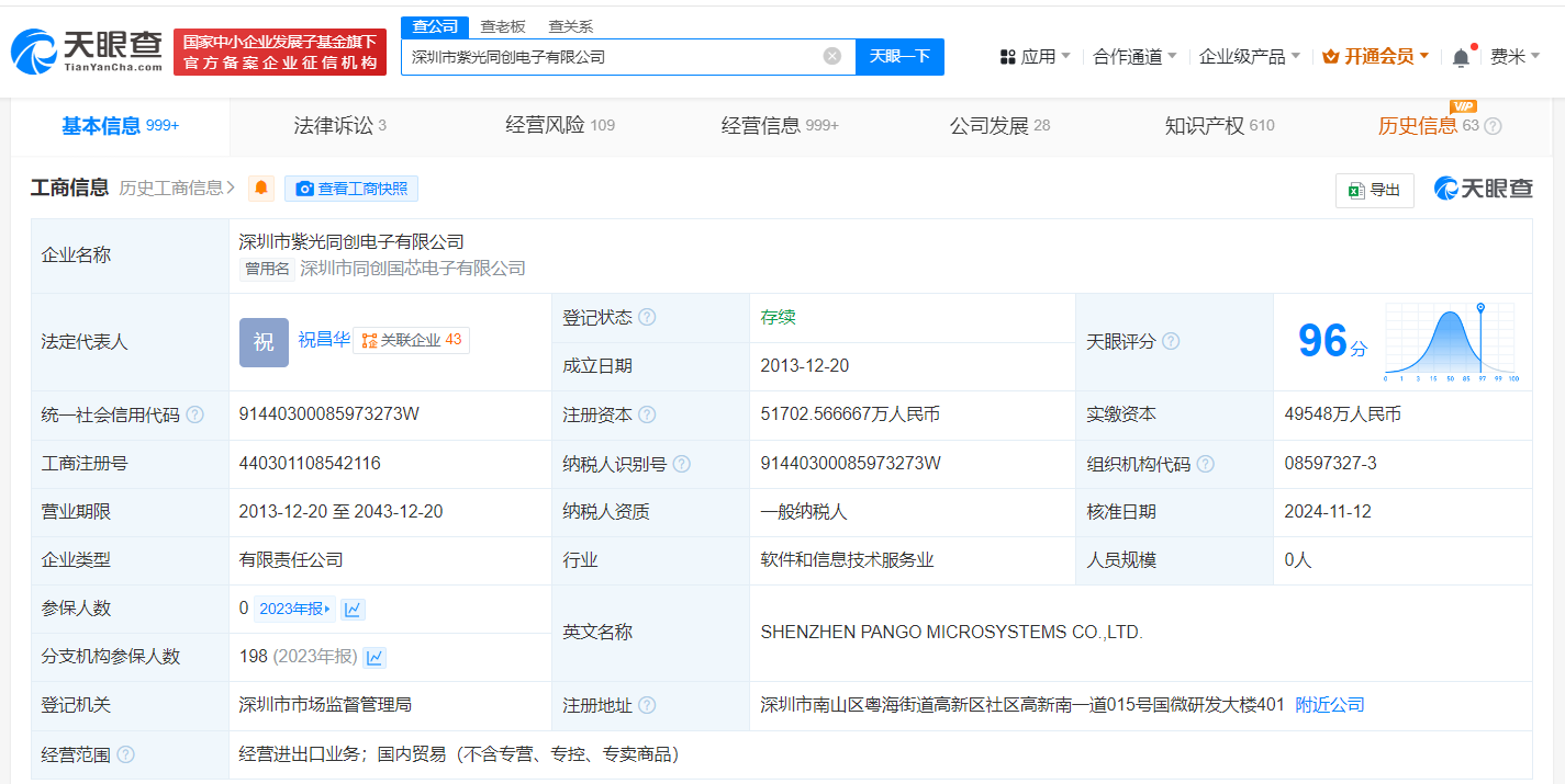 深圳市紫光同创电子有限公司成立于2013年12月,法定代表人为祝昌华,经营范围为经营进出口业务、国内贸易(不含专营、专控、专卖商品),现由西藏茂业创芯科技有限公司、深圳市岭南聚仁企业管理合伙企业(有限合伙)、天津芯翔志坚科技有限公司及上述新增股东等共同持股。官网显示,该公司专业从事可编程系统平台芯片及其配套EDA开发工具的研发与销售。