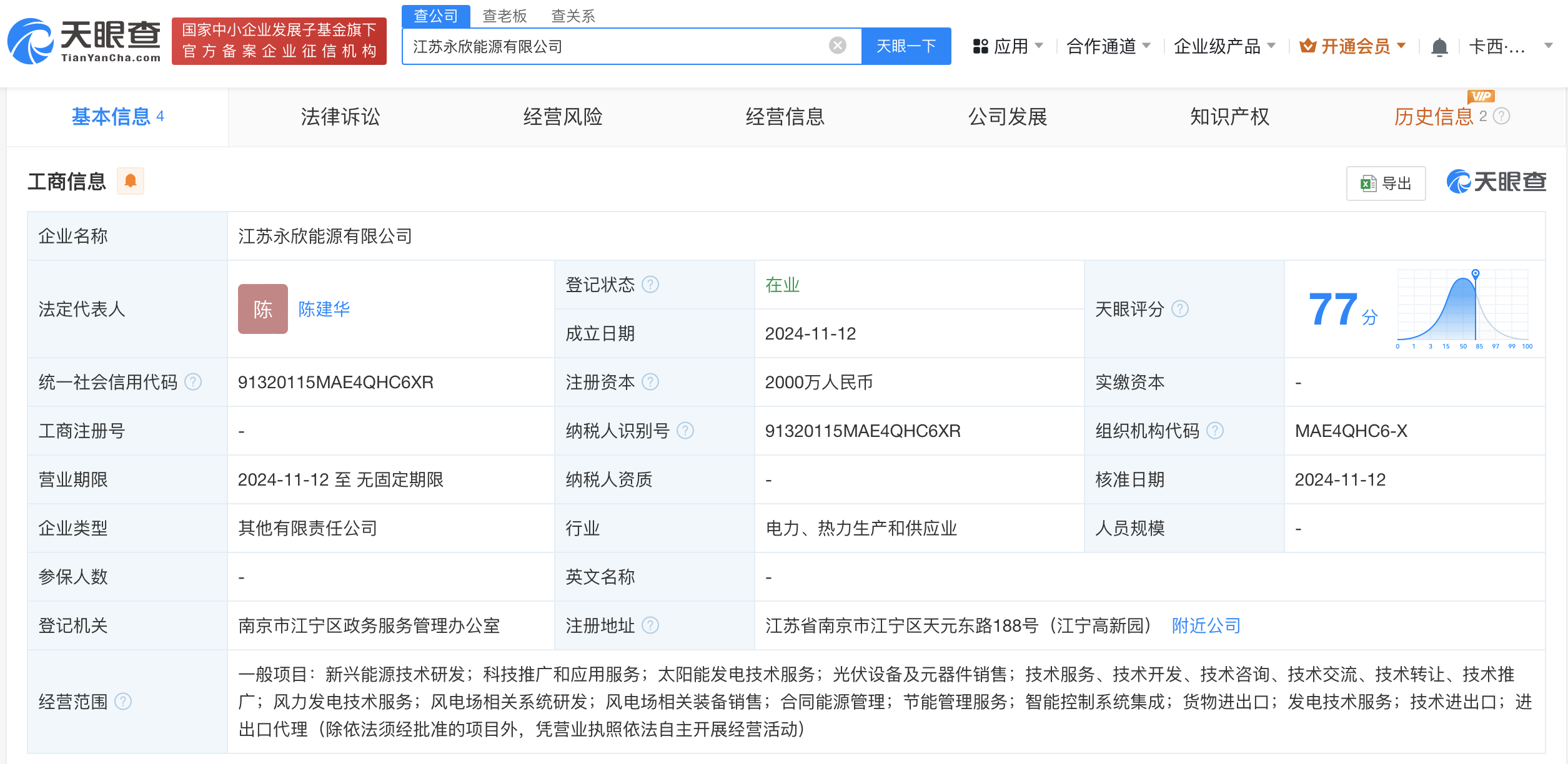 天眼查App显示,近日,江苏永欣能源有限公司成立,法定代表人为陈建华,注册资本2000万人民币,经营范围含新兴能源技术研发、科技推广和应用服务、太阳能发电技术服务、光伏设备及元器件销售等。股东信息显示,该公司由深圳市耀祥能源有限公司、林洋能源(601222)共同持股。
