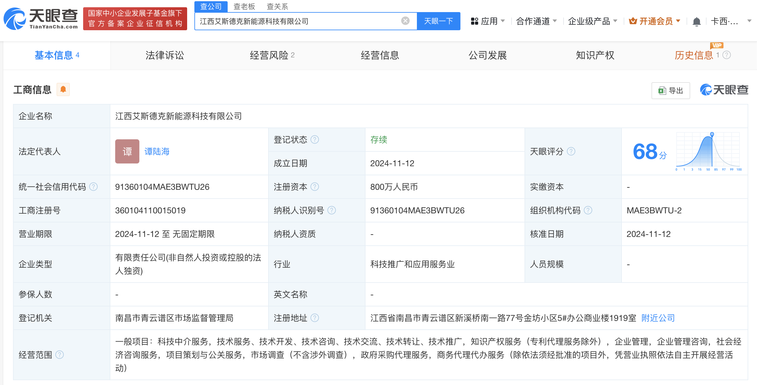 天眼查App显示,近日,江西艾斯德克新能源科技有限公司成立,法定代表人为谭陆海,注册资本800万人民币,经营范围含科技中介服务、企业管理、社会经济咨询服务等。股东信息显示,该公司由华能新能源股份有限公司全资持股。