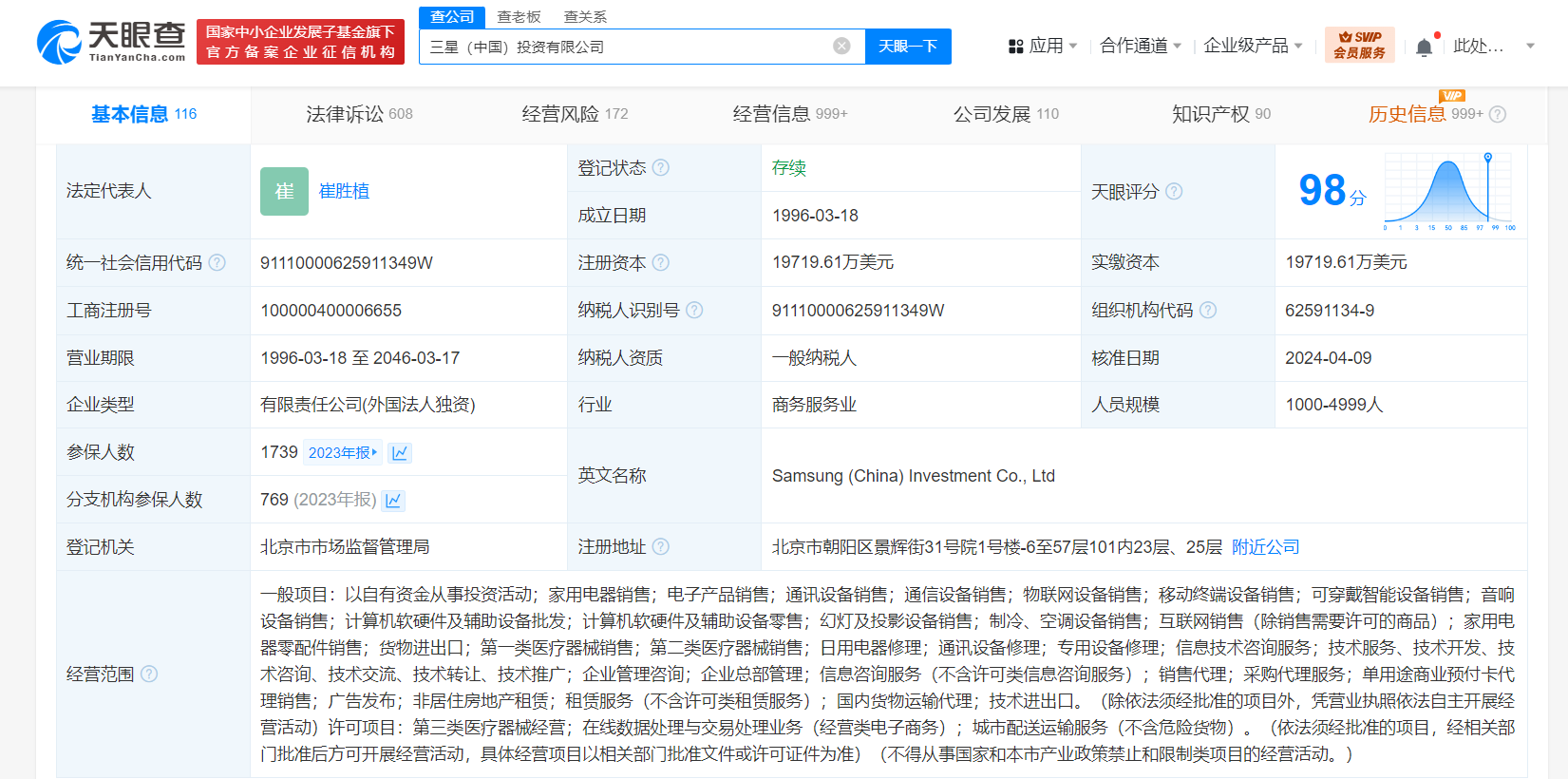 三星(中国)投资有限公司成立于1996年3月,法定代表人为崔胜植,注册资本约1.97亿美元,经营范围包括以自有资金从事投资活动、电子产品销售、通讯设备销售等,由三星电子株式会社全资持股。