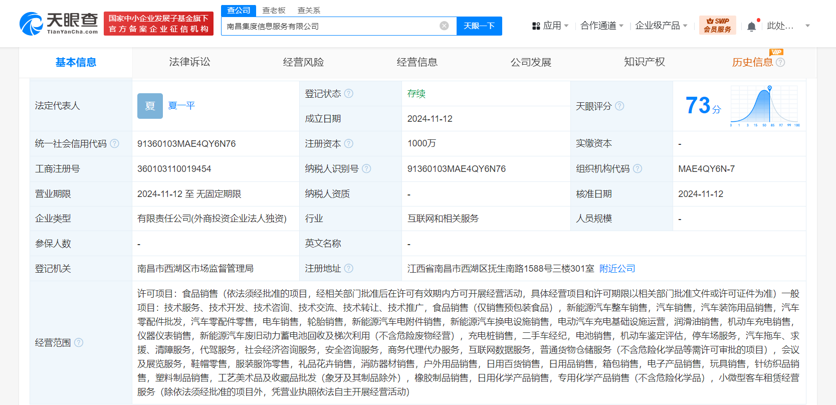 天眼查App显示,近日,南昌集度信息服务有限公司成立,法定代表人为夏一平,注册资本1000万人民币,经营范围含新能源汽车整车销售、汽车装饰用品销售、汽车零配件零售、新能源汽车电附件销售、电动汽车充电基础设施运营、充电桩销售、二手车经纪等。股权全景穿透图显示,该公司由集度科技(武汉)有限公司全资持股,后者为集度汽车(香港)有限公司全资子公司。