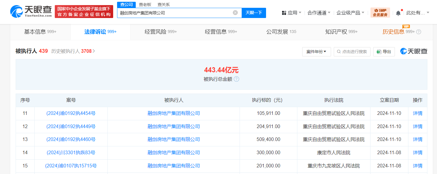 深度风险信息显示,融创房地产集团有限公司现存430余条被执行人信息,被执行总金额超443亿元。此外,该公司还存在多条限制消费令、失信被执行人(老赖)及终本案件信息。