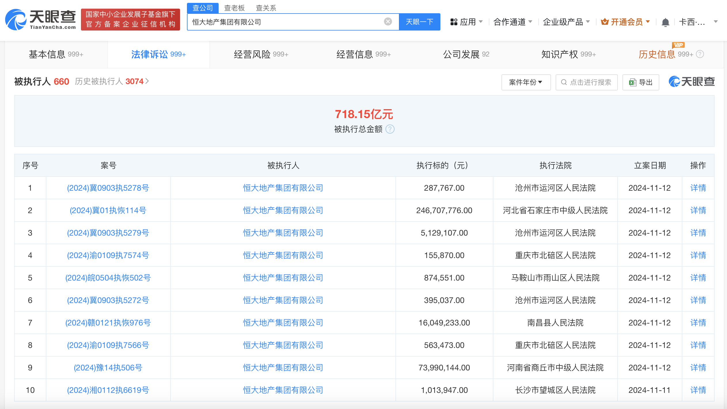 深度风险信息显示,恒大地产集团有限公司现存660条被执行人信息,被执行总金额超718亿元。此外,该公司还存在多条限制消费令、失信被执行人(老赖)及终本案件信息。
