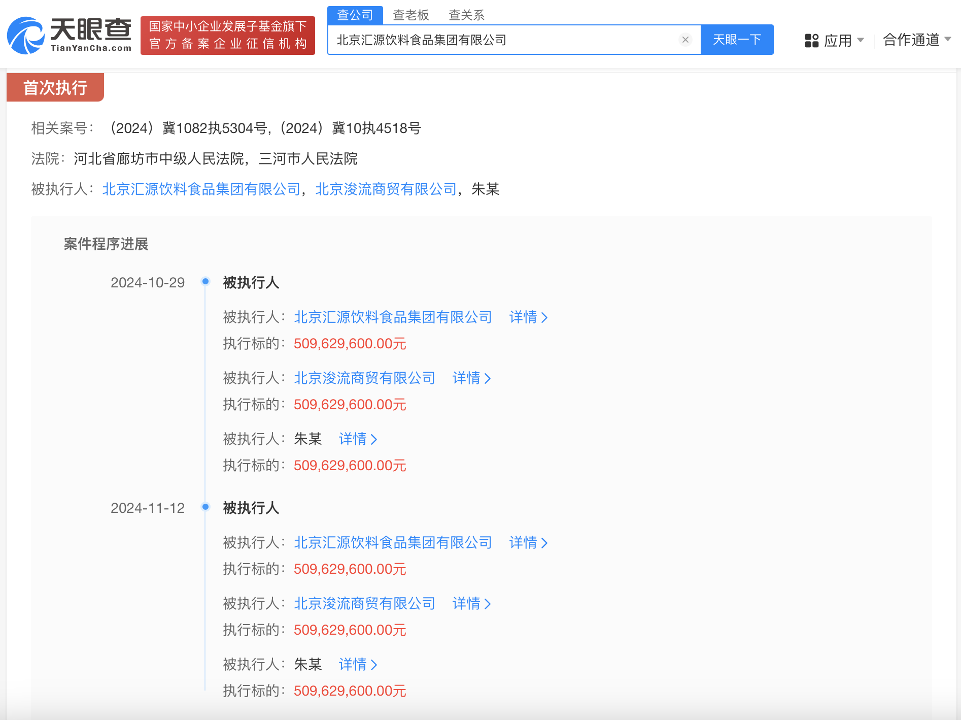 天眼查法律诉讼信息显示,11月12日,北京汇源饮料食品集团有限公司、北京浚流商贸有限公司、朱新礼新增一条被执行人信息,执行标的5亿余元,执行法院为三河市人民法院。