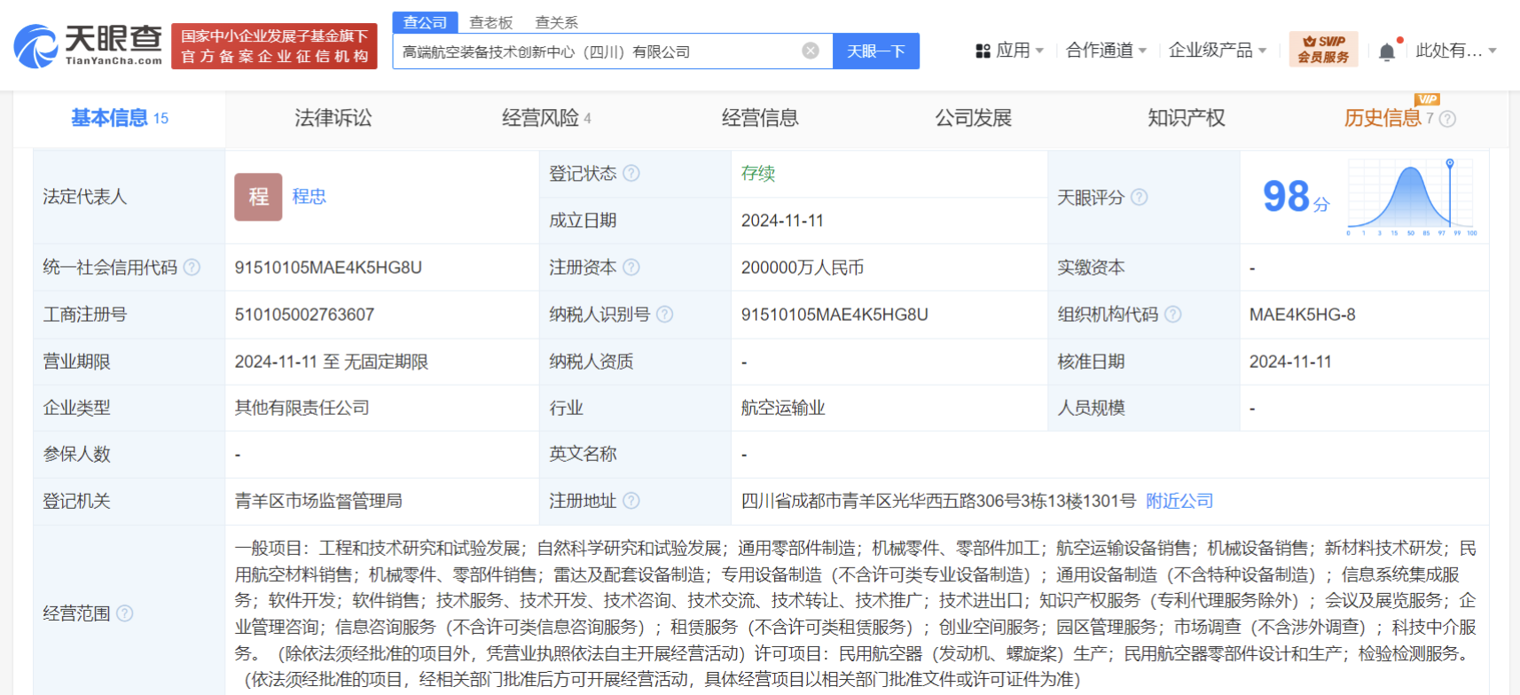 天眼查App显示,近日,高端航空装备技术创新中心(四川)有限公司成立,法定代表人为程忠,注册资本20亿人民币,经营范围含工程和技术研究和试验发展,自然科学研究和试验发展,通用零部件制造,机械零件、零部件加工,航空运输设备销售,机械设备销售,新材料技术研发,民用航空材料销售等。股东信息显示,该公司由成都飞机工业(集团)有限责任公司、成都天府航空装备产业发展有限公司、四川发展航空产业投资集团有限公司、中国航空工业集团有限公司等共同持股。