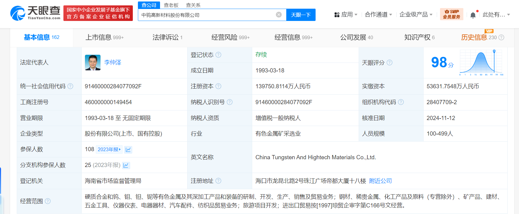 天眼查App显示,近日,中钨高新(000657)发生工商变更,注册资本由约10.75亿人民币增至约13.98亿人民币。