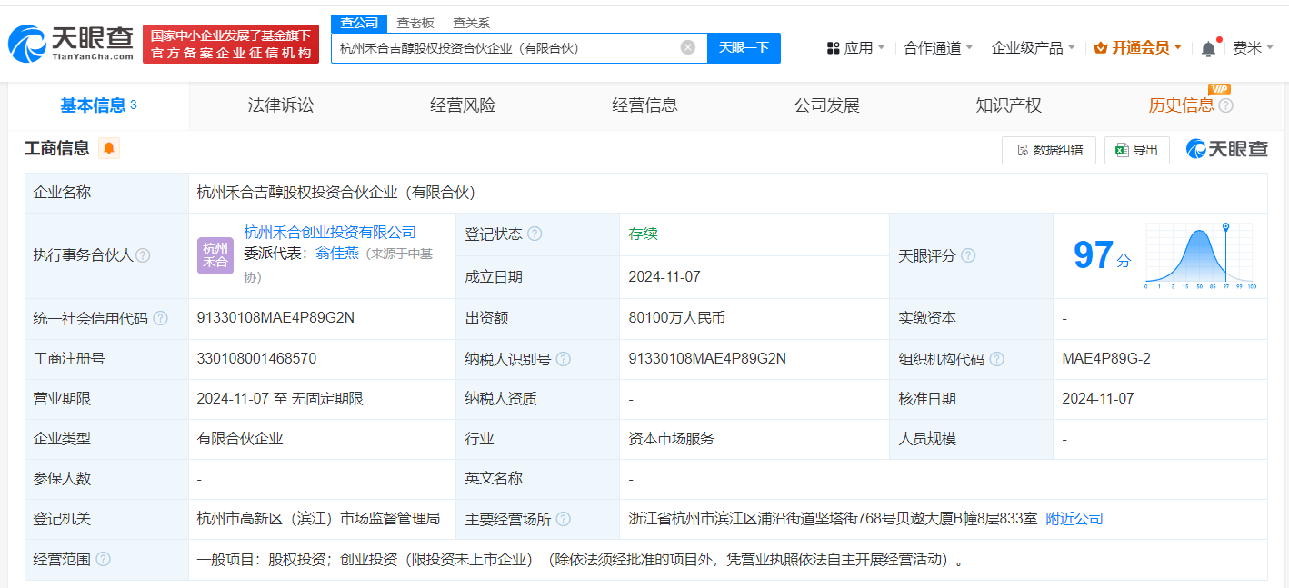 天眼查App显示,近日,杭州禾合吉醇股权投资合伙企业(有限合伙)成立,执行事务合伙人为杭州禾合创业投资有限公司,出资额8.01亿人民币,经营范围为股权投资、创业投资(限投资未上市企业)。合伙人信息显示,该合伙企业由杭州高新创业投资有限公司、杭州禾合创业投资有限公司共同出资。