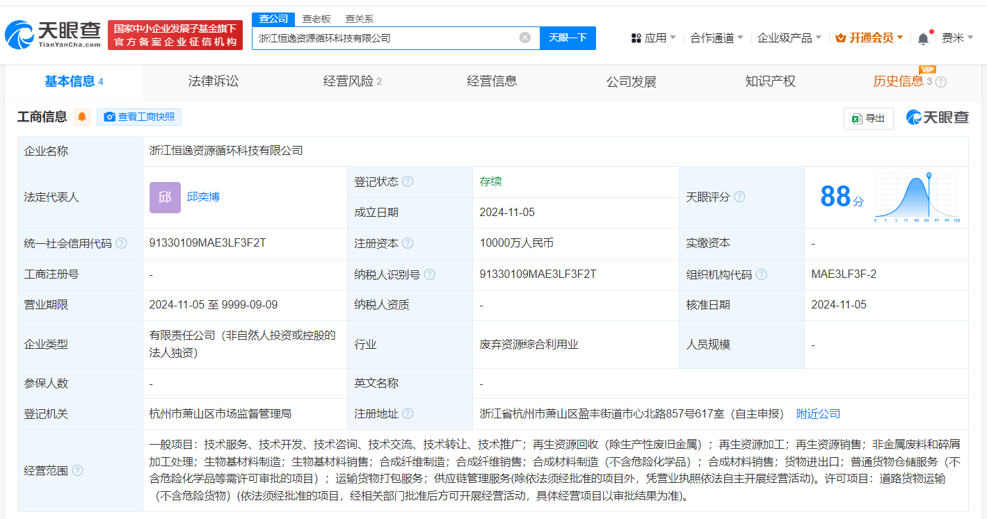 天眼查App显示,近日,浙江恒逸资源循环科技有限公司成立,法定代表人为邱奕博,注册资本1亿人民币,经营范围含再生资源加工、非金属废料和碎屑加工处理、生物基材料制造、生物基材料销售、合成纤维制造、合成纤维销售等。股权全景穿透图显示,该公司由浙江恒逸石化有限公司全资持股,后者为恒逸石化(000703)全资子公司。
