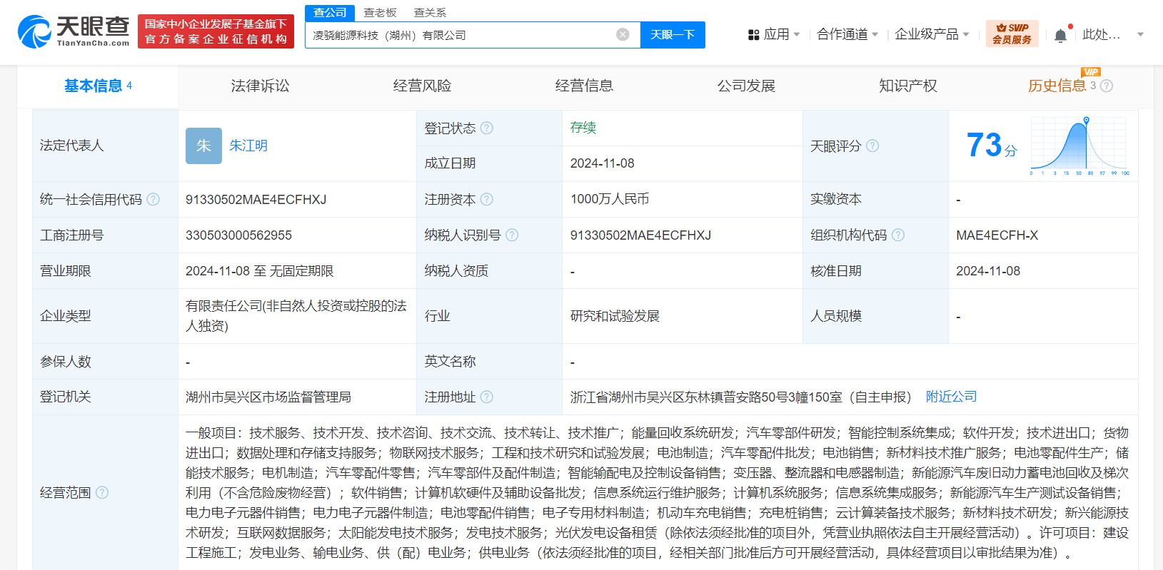 天眼查App显示,近日,凌骁能源科技(湖州)有限公司成立,法定代表人为朱江明,注册资本1000万人民币,经营范围含能量回收系统研发、汽车零部件研发、智能控制系统集成、数据处理和存储支持服务、工程和技术研究和试验发展、储能技术服务、智能输配电及控制设备销售等。股权全景穿透图显示,该公司由浙江凌骁能源科技有限公司全资持股,后者为零跑汽车(HK.09863)全资子公司。