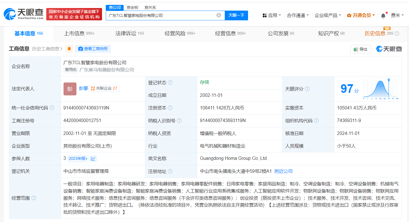 天眼查App显示,近日,TCL智家(002668)及其大股东TCL家电集团有限公司发生工商变更,胡殿谦卸任法定代表人、董事长,由彭攀接任。