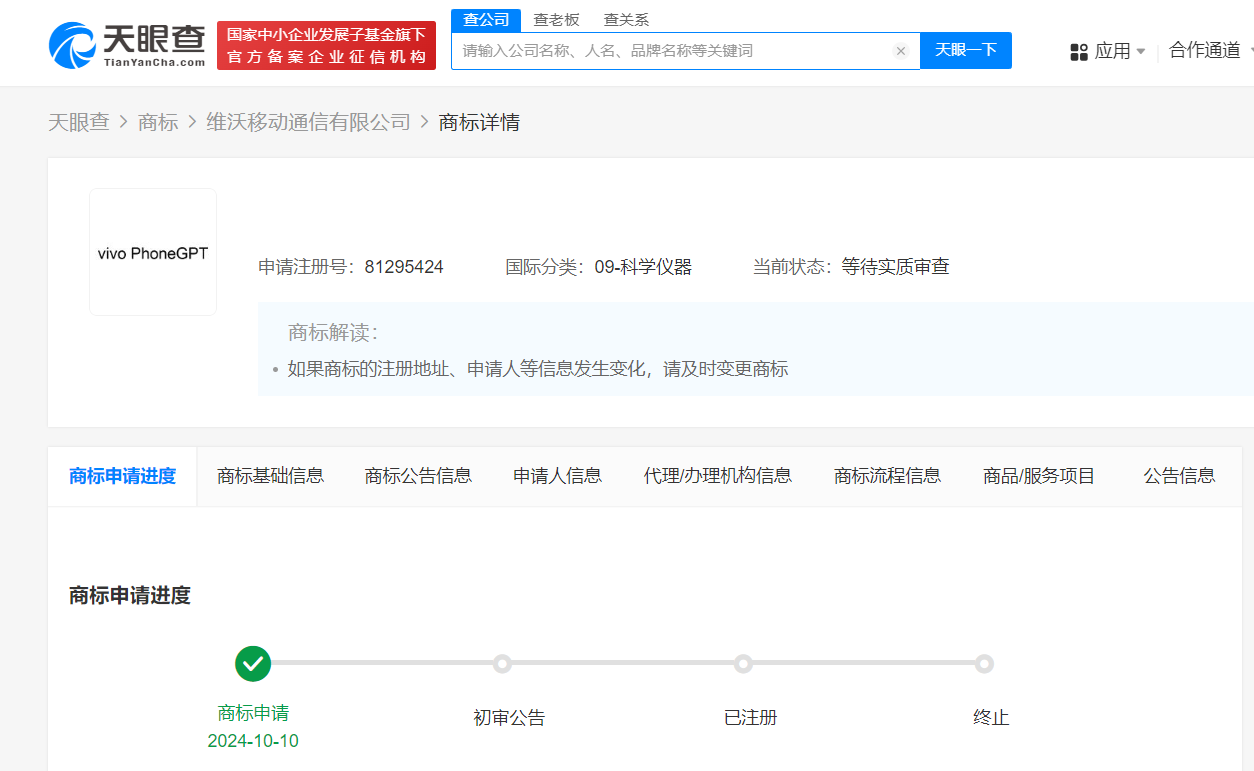 天眼查知识产权信息显示,近日,维沃移动通信有限公司申请注册多枚“vivo PhoneGPT”“iQOO PhoneGPT”商标,国际分类涉及科学仪器、网站服务,当前商标状态均为等待实质审查。