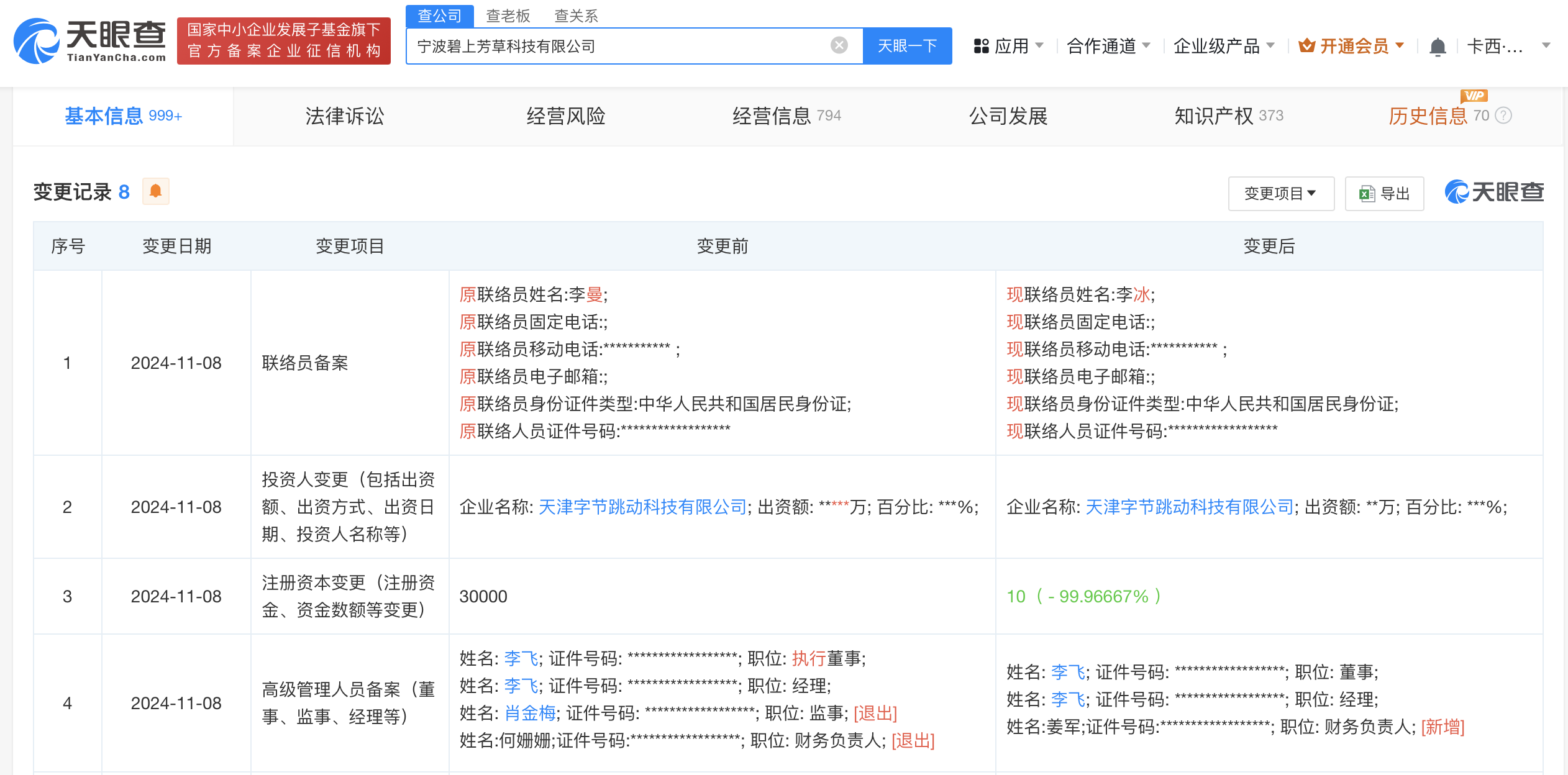 天眼查App显示,近日,宁波碧上芳草科技有限公司发生工商变更,注册资本由3亿人民币减至10万人民币,降幅约99.97%,同时部分主要人员发生变更。