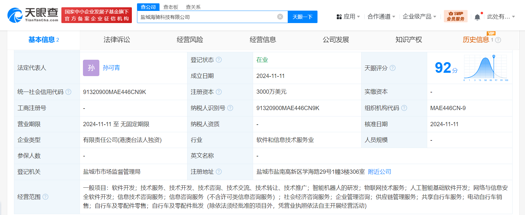 天眼查App显示,近日,盐城海骑科技有限公司成立,法定代表人为孙可青,注册资本3000万美元,经营范围含智能机器人的研发、物联网技术服务、人工智能基础软件开发、网络与信息安全软件开发、信息技术咨询服务、企业管理咨询等。股东信息显示,该公司由美团旗下Xigua Limited全资持股。
