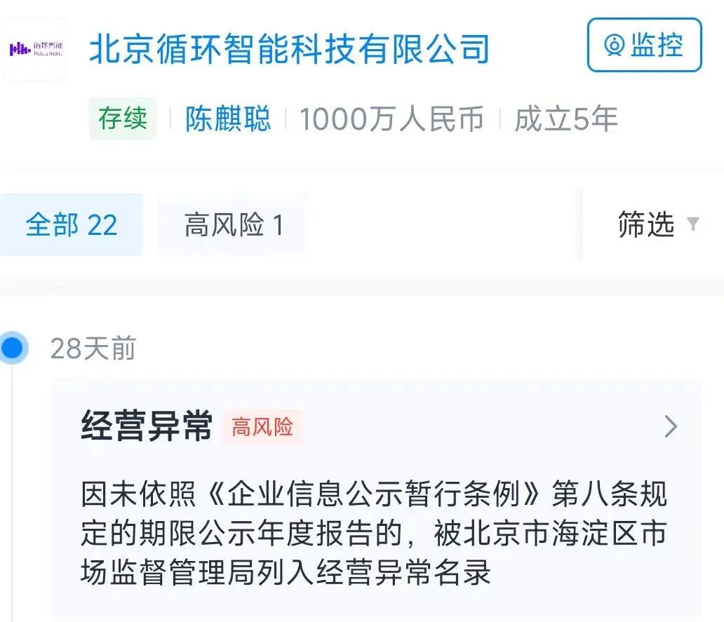 天眼查信息显示,截至2024年11月,北京循环智能科技有限公司已经被列入经营异常名录。