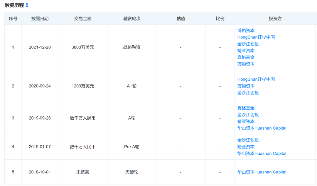 天眼查显示,自2018年至2021年的融资历程中,公司主要投资方包括华山资本、金沙江创投、靖亚资本、万物资本、红杉中国、真格基金、博裕资本等。
