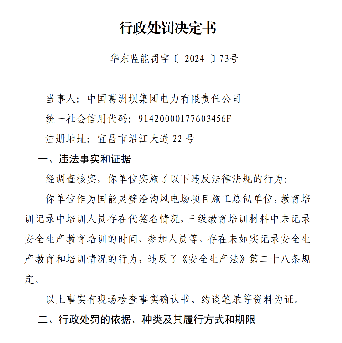 11月6日,国家能源局华东监管局发布华东监能罚字【2024】73号文件,对中国葛洲坝集团电力有限责任公司违反法律法规的行为进行处罚。